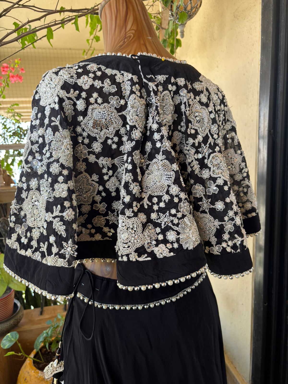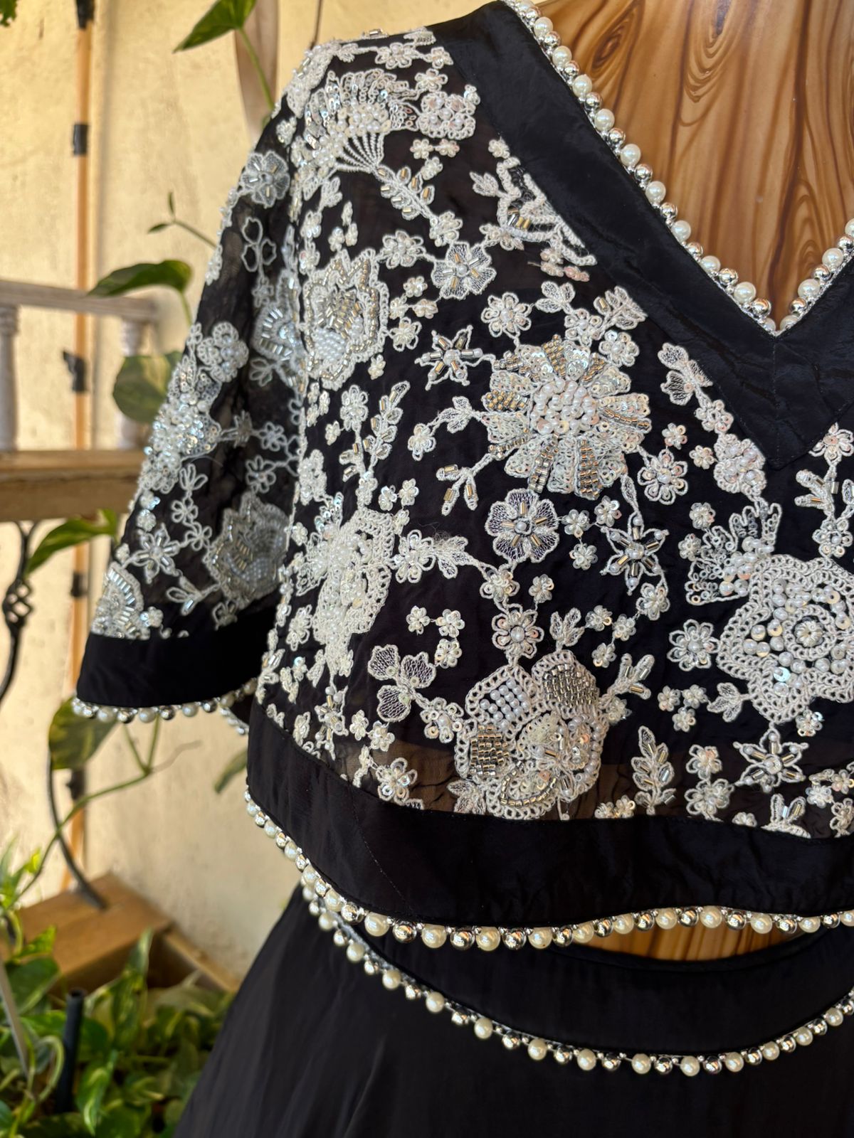 The floral embroidery tells its own story—silver blooms scattered across the black bodice like moonlight flowers, creating romantic beauty against the bold base. Pearl and crystal embellishments along the edges add subtle luxury, while the clean black skirt provides dramatic simplicity that lets the embroidered blouse shine.