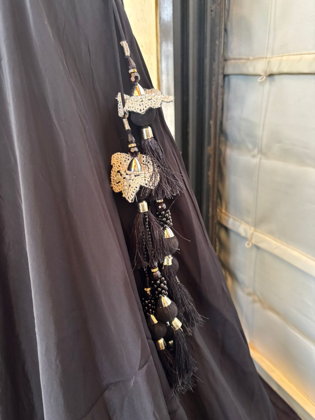 The genius of this lehenga is its restraint. By keeping the skirt largely unembellished, it creates beautiful balance with the ornate blouse. The black fabric has its own presence—rich, dramatic, elegant—without competing with the silver florals above.
