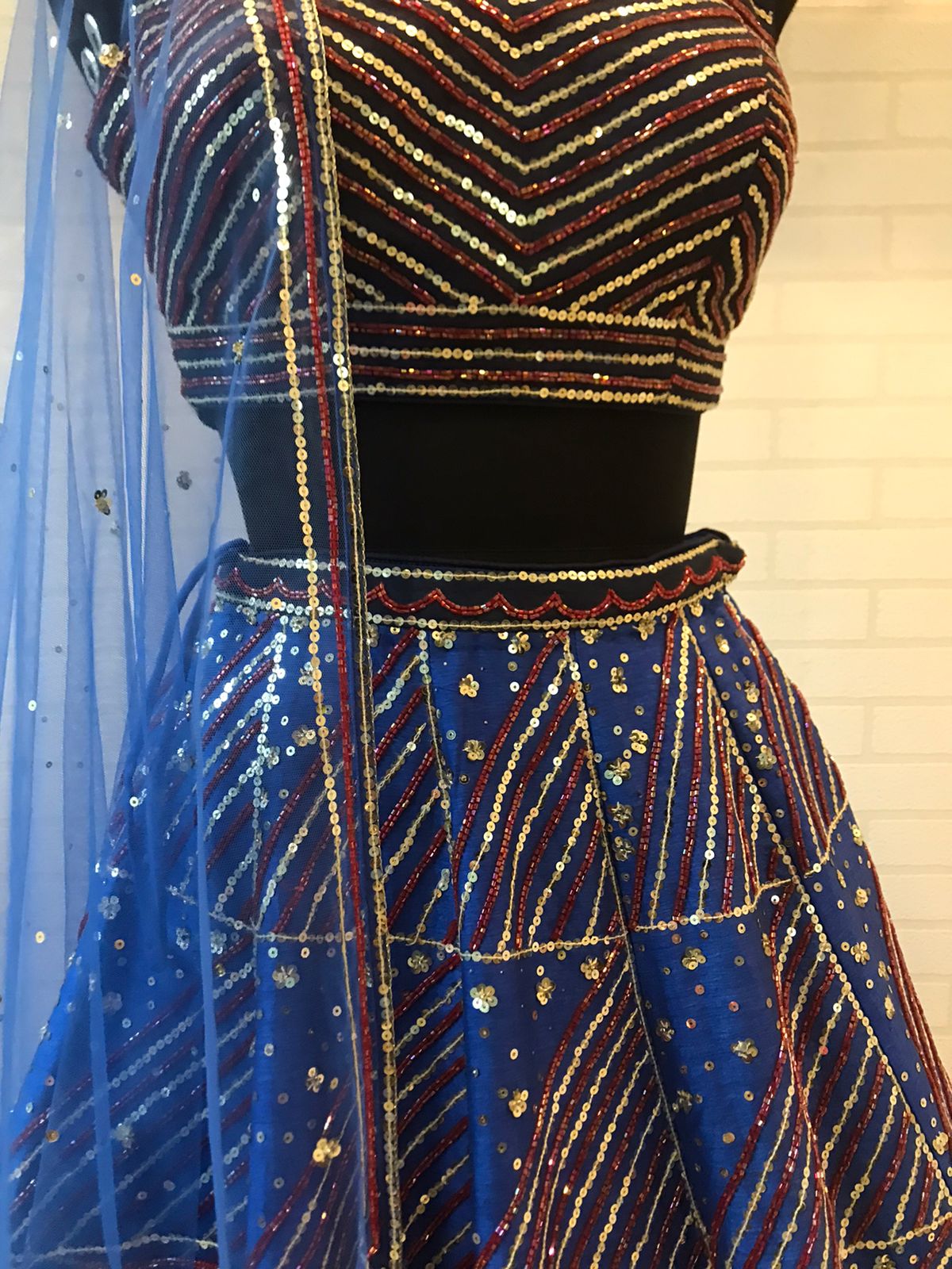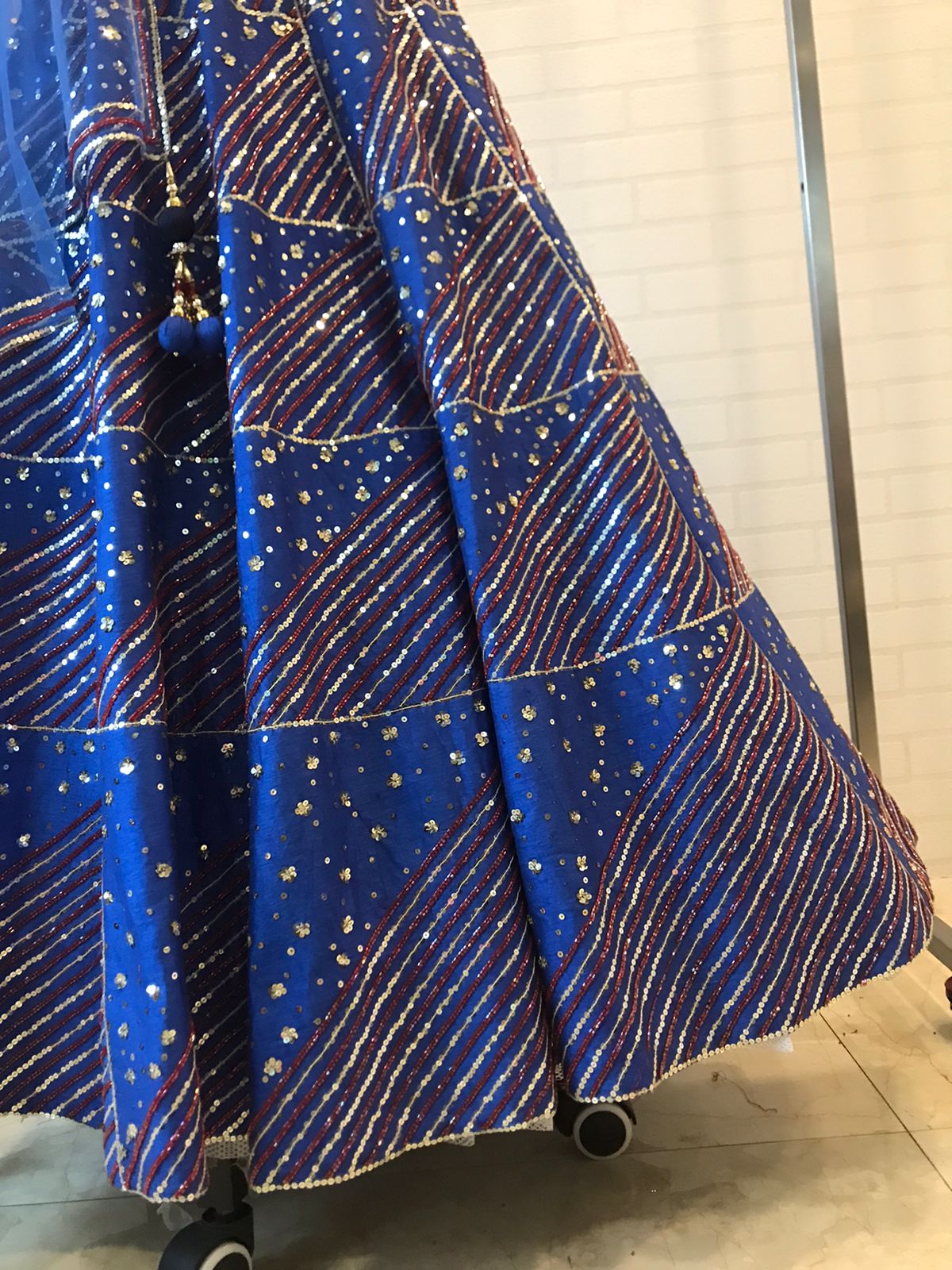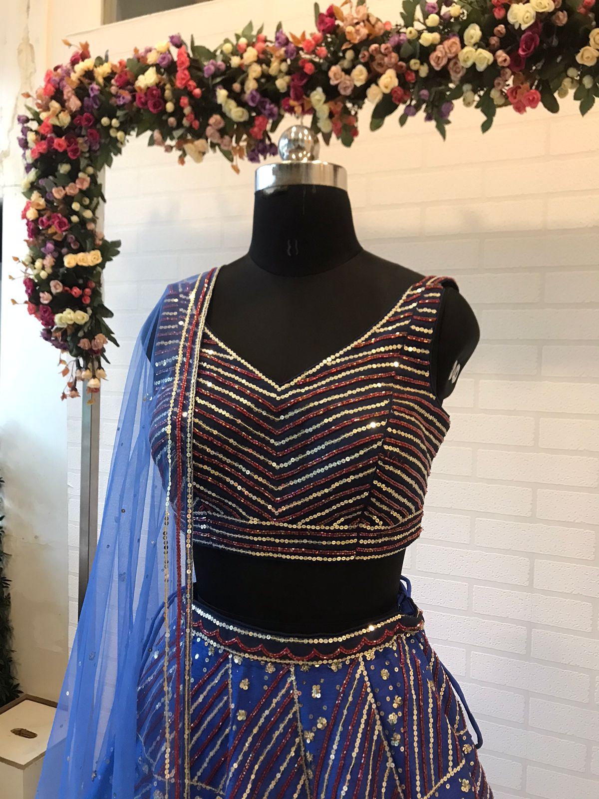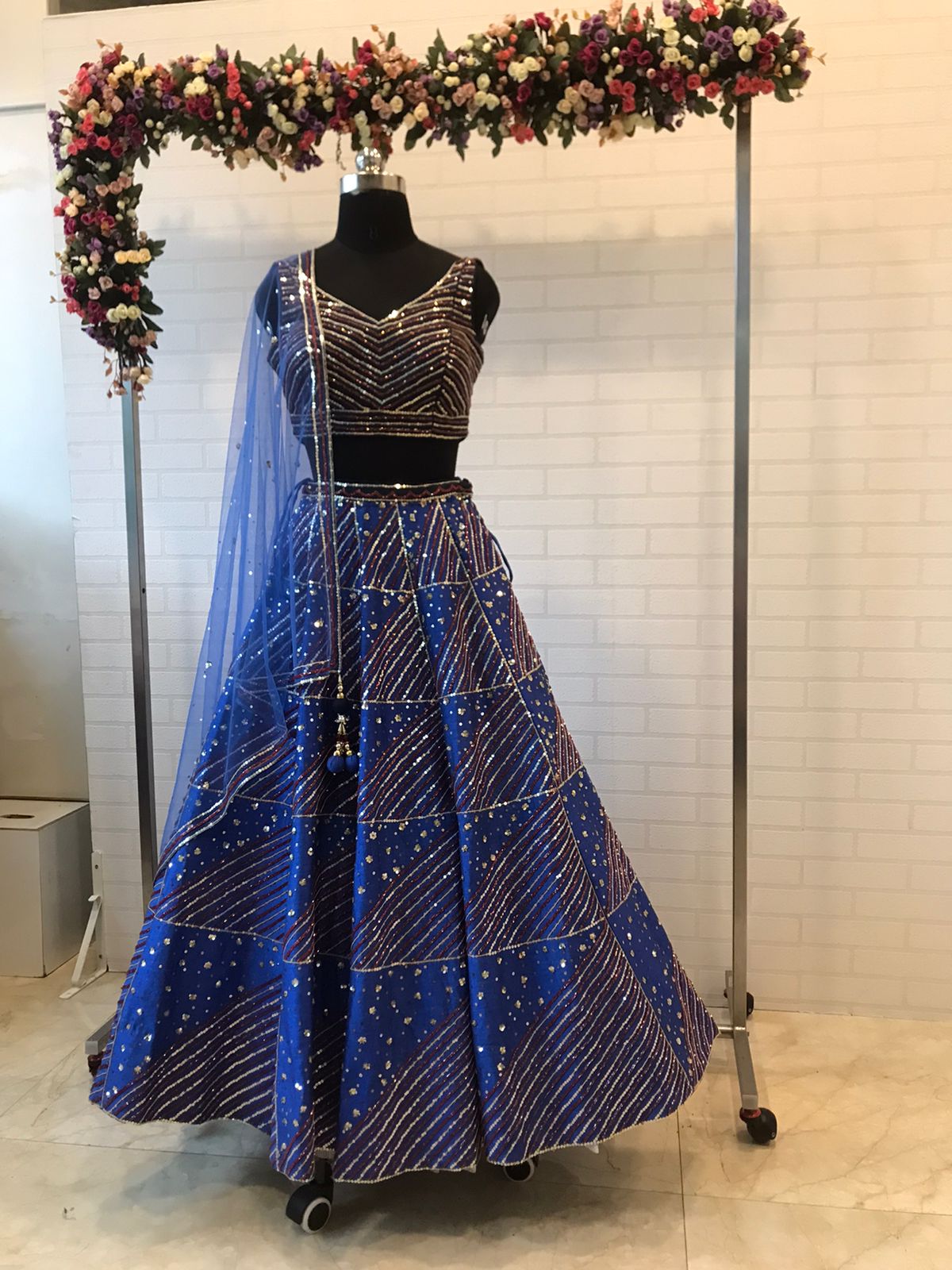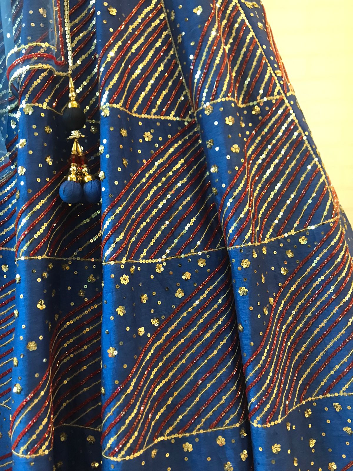 What sets this ensemble apart is its bold geometric design. The lehenga features an architectural pattern of triangles, chevrons, and angular motifs outlined in shimmering gold gota and sequin work. Against the rich midnight blue base, these golden lines create a striking contrast—like constellations drawn by an artist who believes structure can be beautiful, that geometry can be grace.
