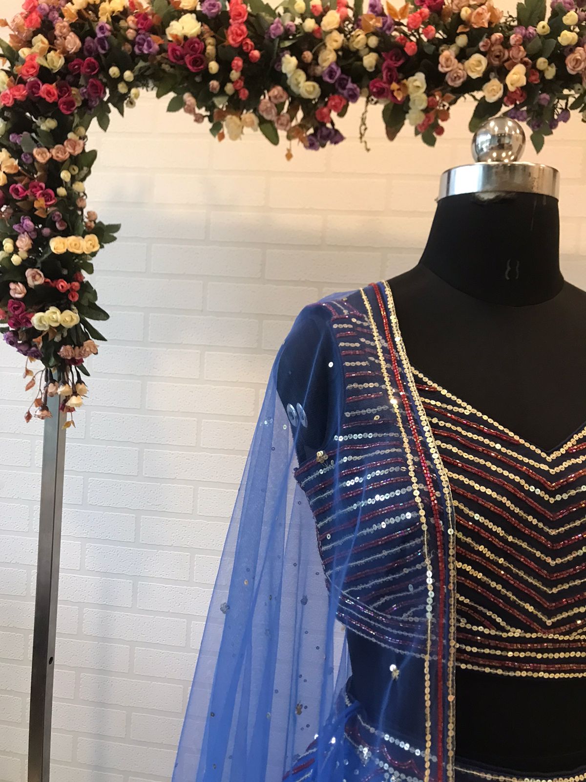 Midnight Constellation captures that exact moment and transforms it into wearable art. This isn't just a lehenga. It's a night sky mapped in sequins and gold, where geometric patterns become celestial navigation, and every step you take writes poetry across a canvas of deepest blue.