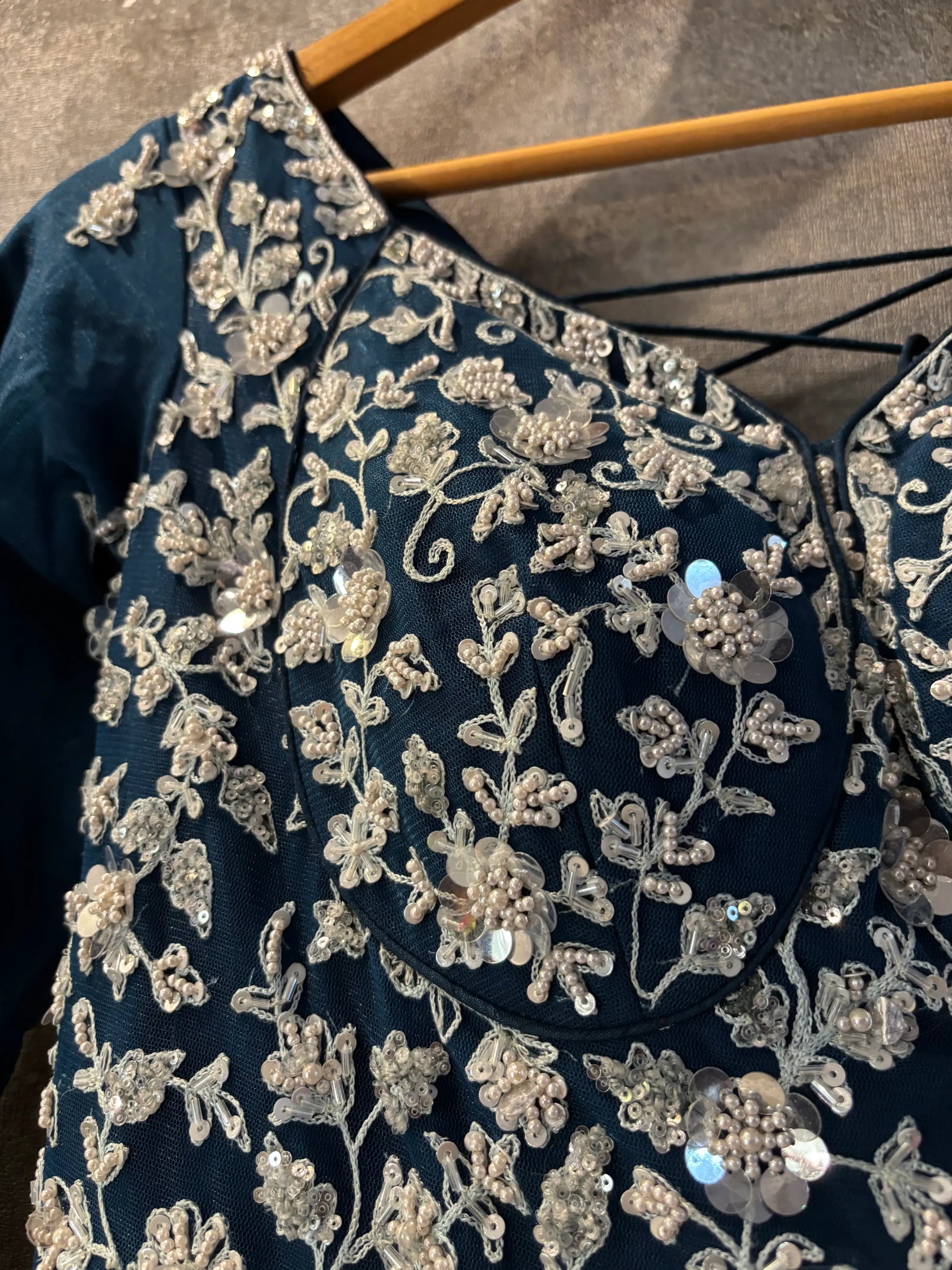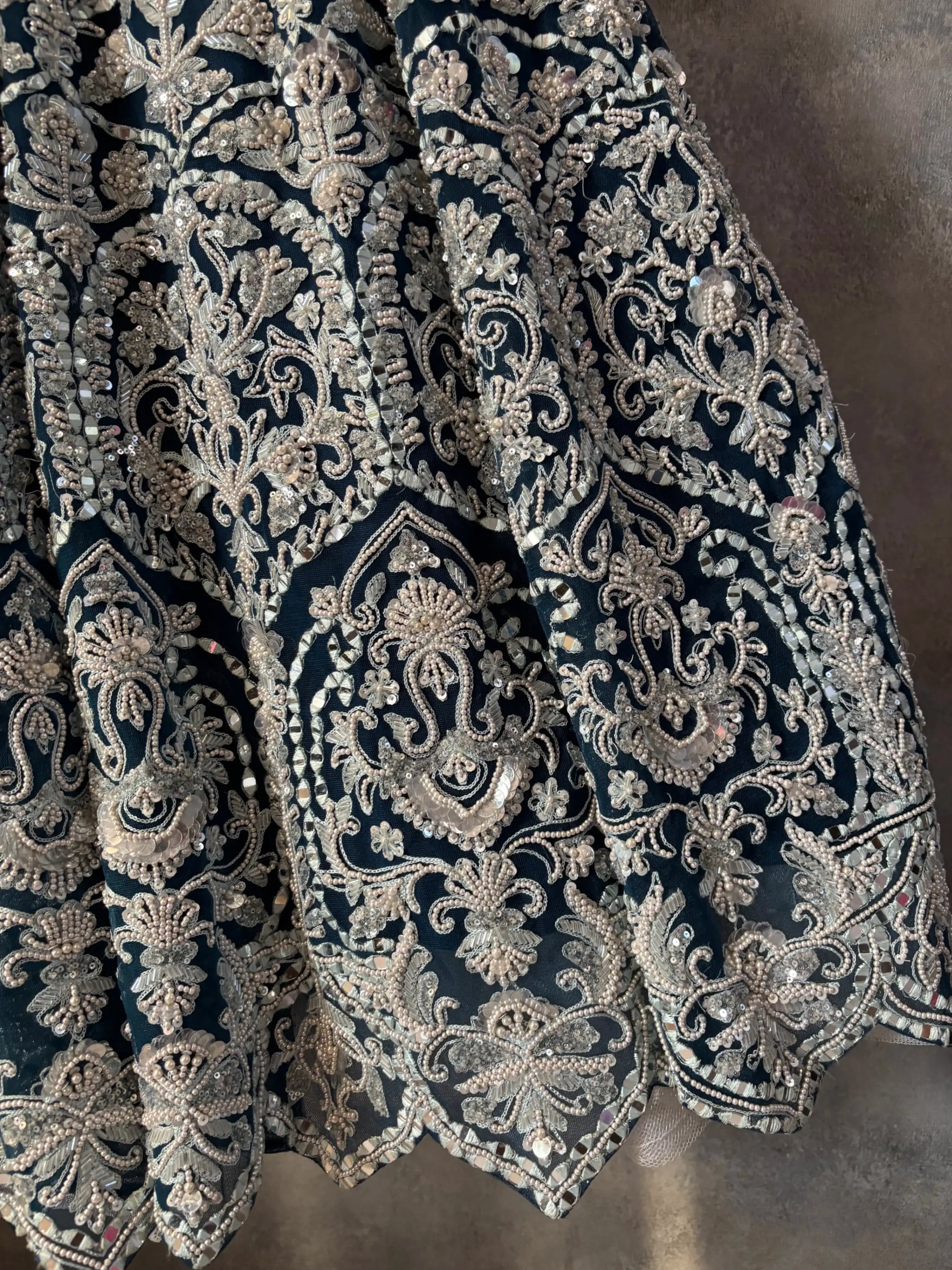Pearls, sequins and hand-threaded motifs are placed with intention — never mass-produced, never rushed.