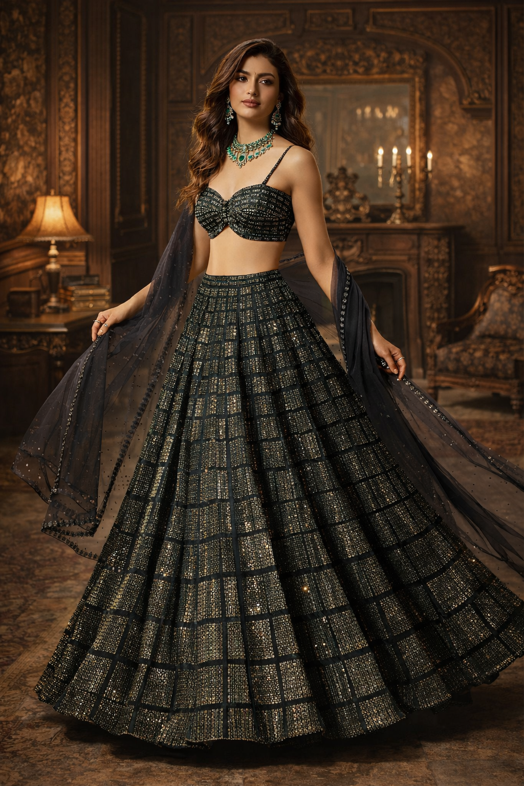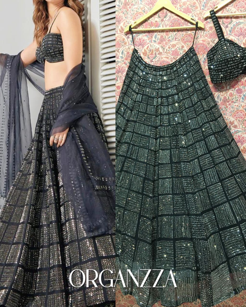 Crafted on a deep midnight-charcoal base, the silhouette is defined by an architectural grid-work that feels both futuristic and timeless. The strappy bustier glows with intense hand-alignment, while the lehenga skirt cascades in a rhythmic pattern of shimmering squares, catching the light with every beat of the music.