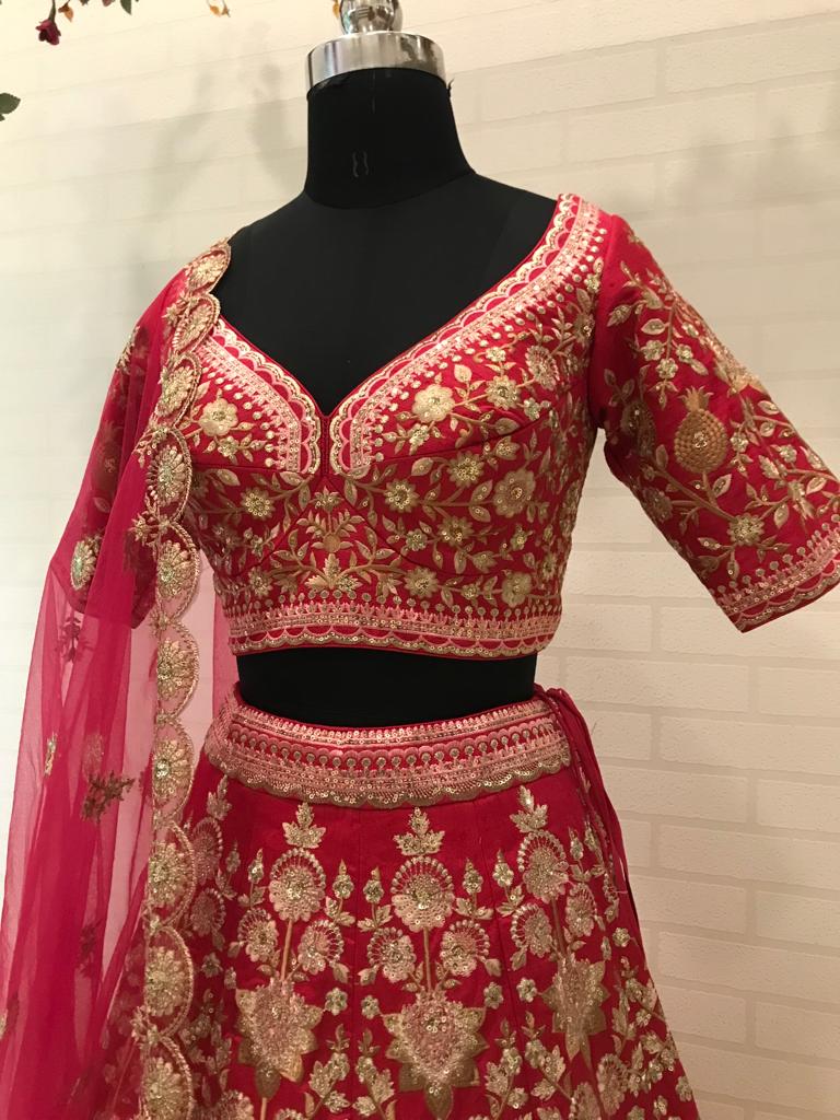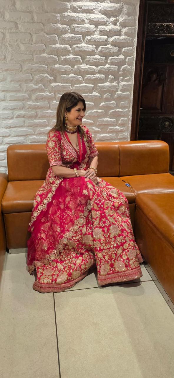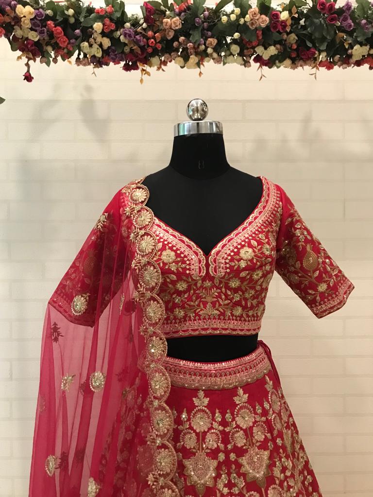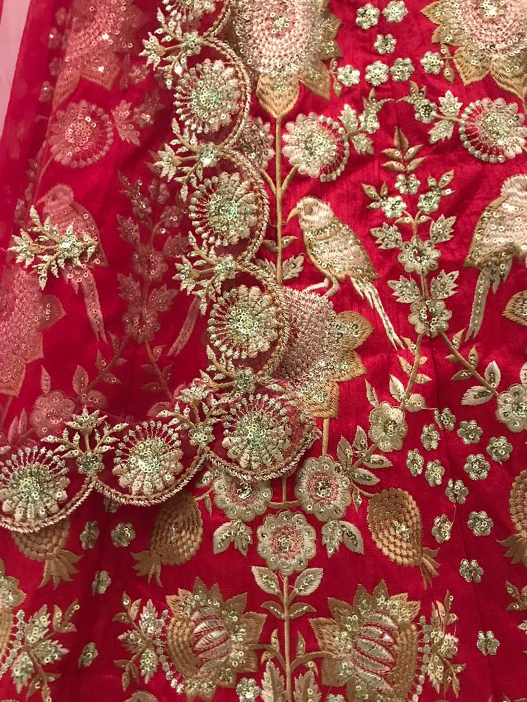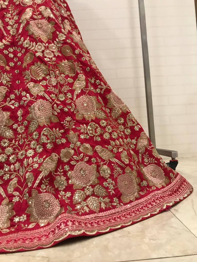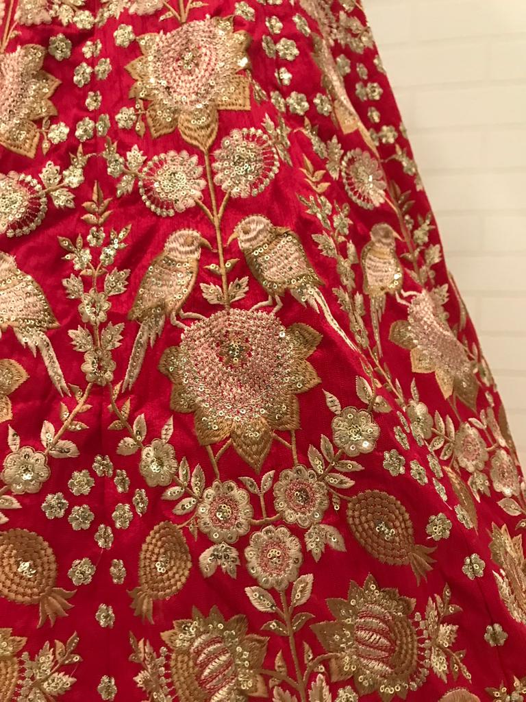 The rich red base carries the warmth of celebration, while the antique gold embroidery narrates a story of abundance. Unlike abstract patterns, the motifs here are alive—birds perched on flowering vines symbolize harmony and eternal love, making this lehenga a spiritual talisman for the journey ahead.