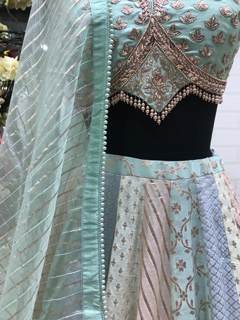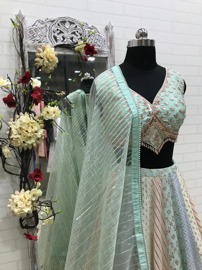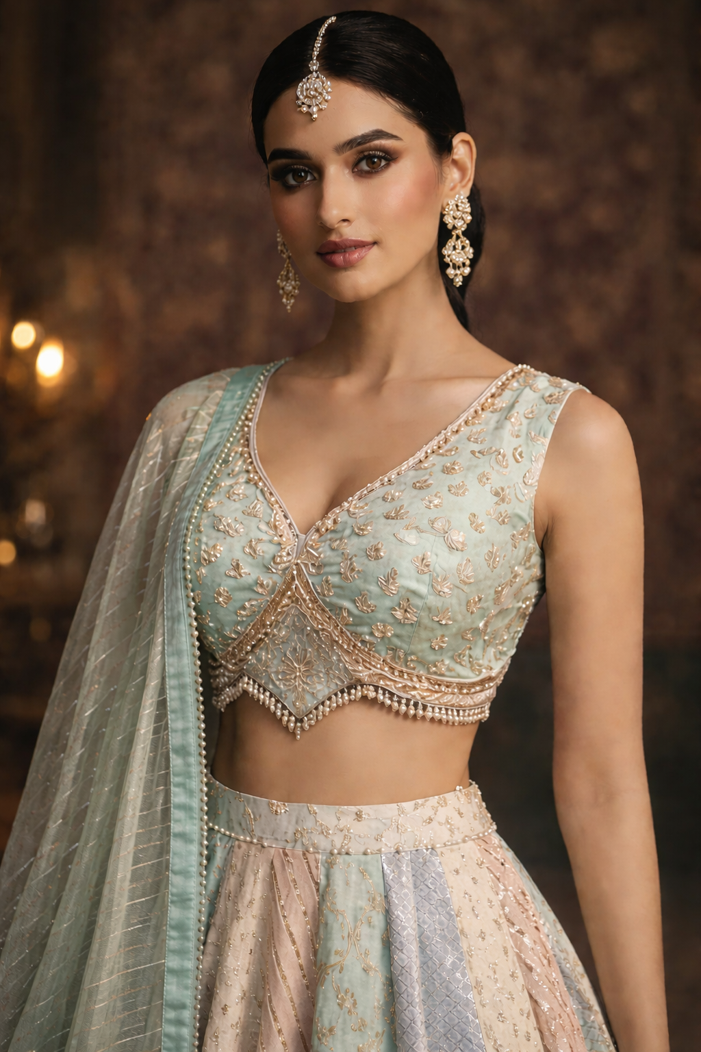Blouse Coordination: The two-toned blouse is designed to pull colors from the lehenga—mint and blush—creating visual connection between bodice and skirt.