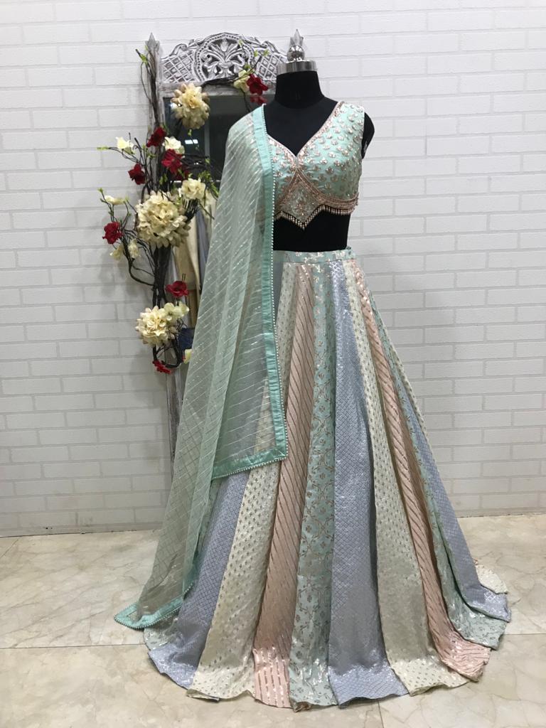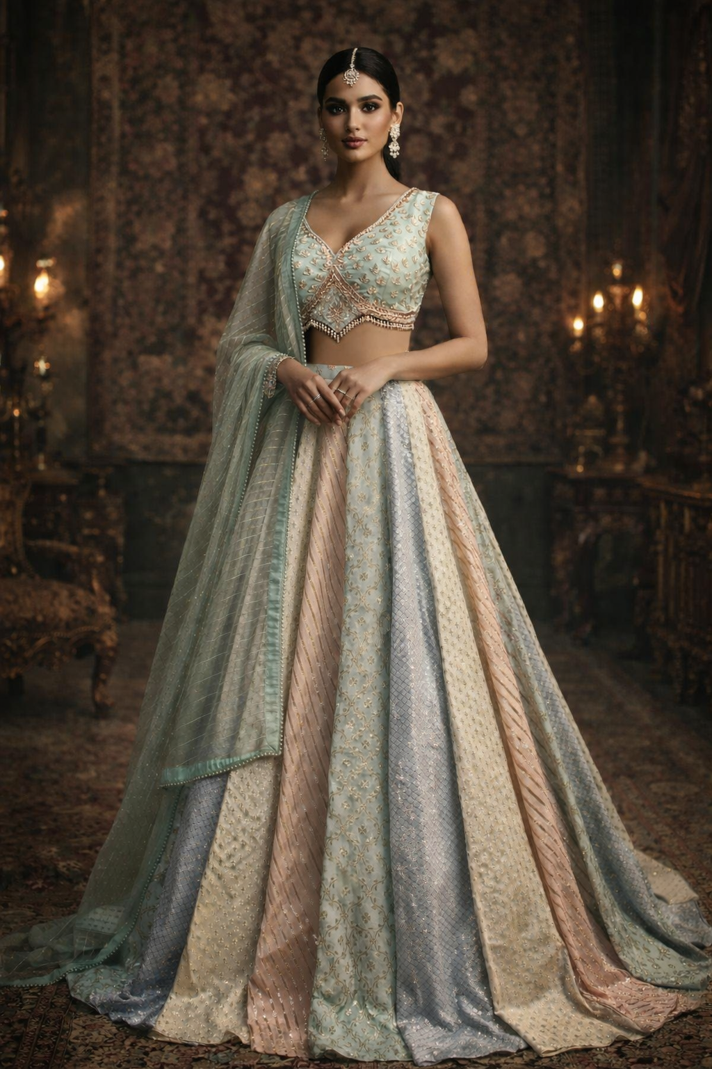 The magic lies in the multi-panel construction—each section of the lehenga features a different pastel shade with its own unique embroidered pattern. Vertical panels in mint, rose, blue, and champagne create a patchwork of texture and color that's sophisticated rather than chaotic. The result is dimensional, dynamic, and impossibly chic.
