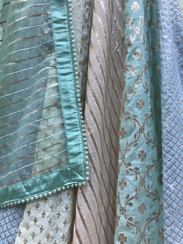 The mint green acts as a unifying element—tying together the various pastel shades of the ensemble while providing a dominant color anchor. The sheer quality ensures it drapes beautifully without adding bulk.