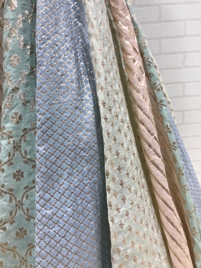 The lehenga is a brilliant exercise in coordinated diversity. Rather than uniform fabric and embroidery, each vertical panel is treated as its own entity—yet all panels work together in perfect harmony.