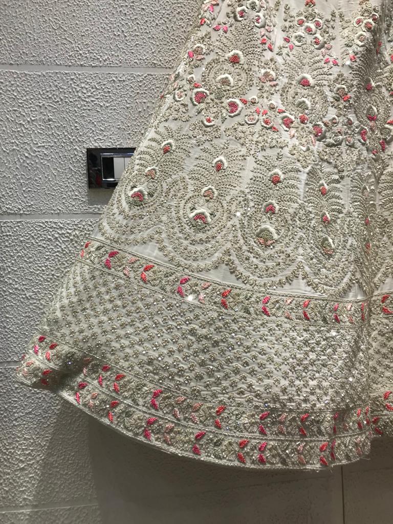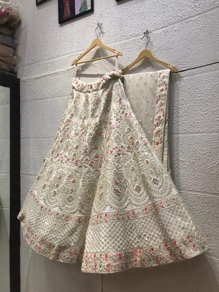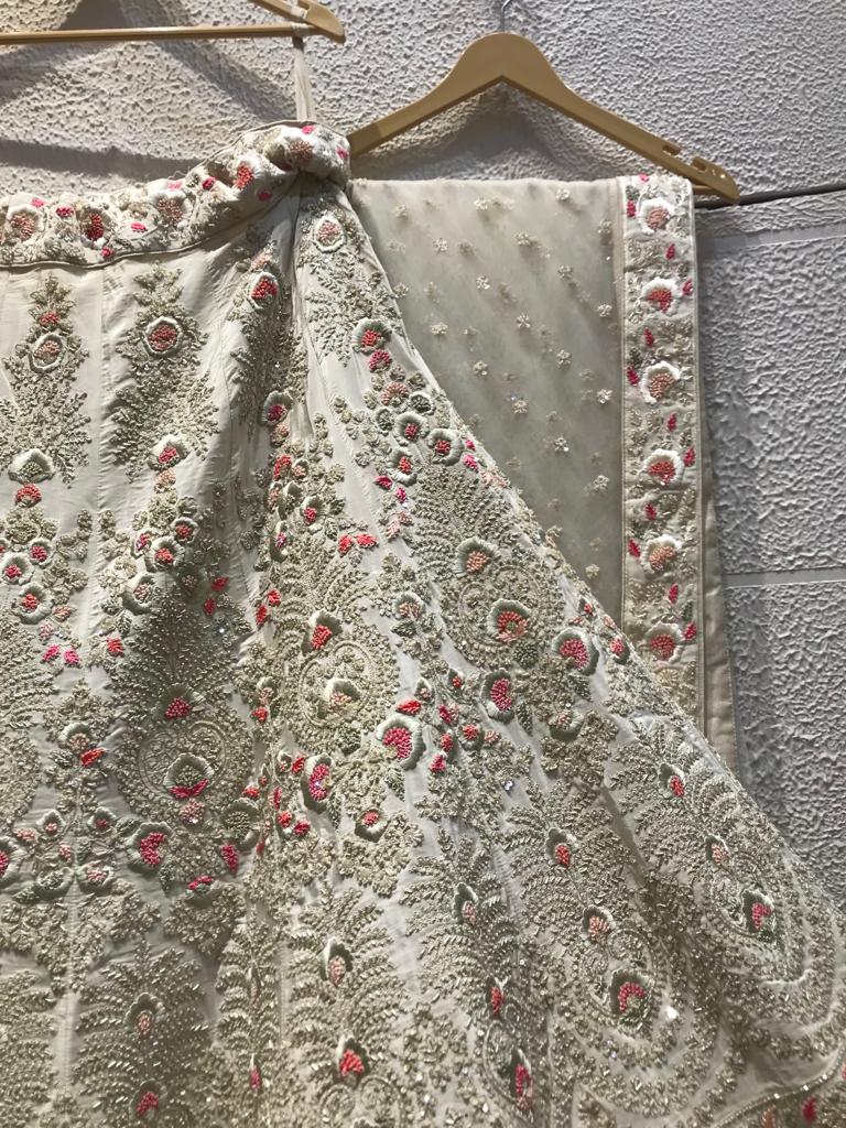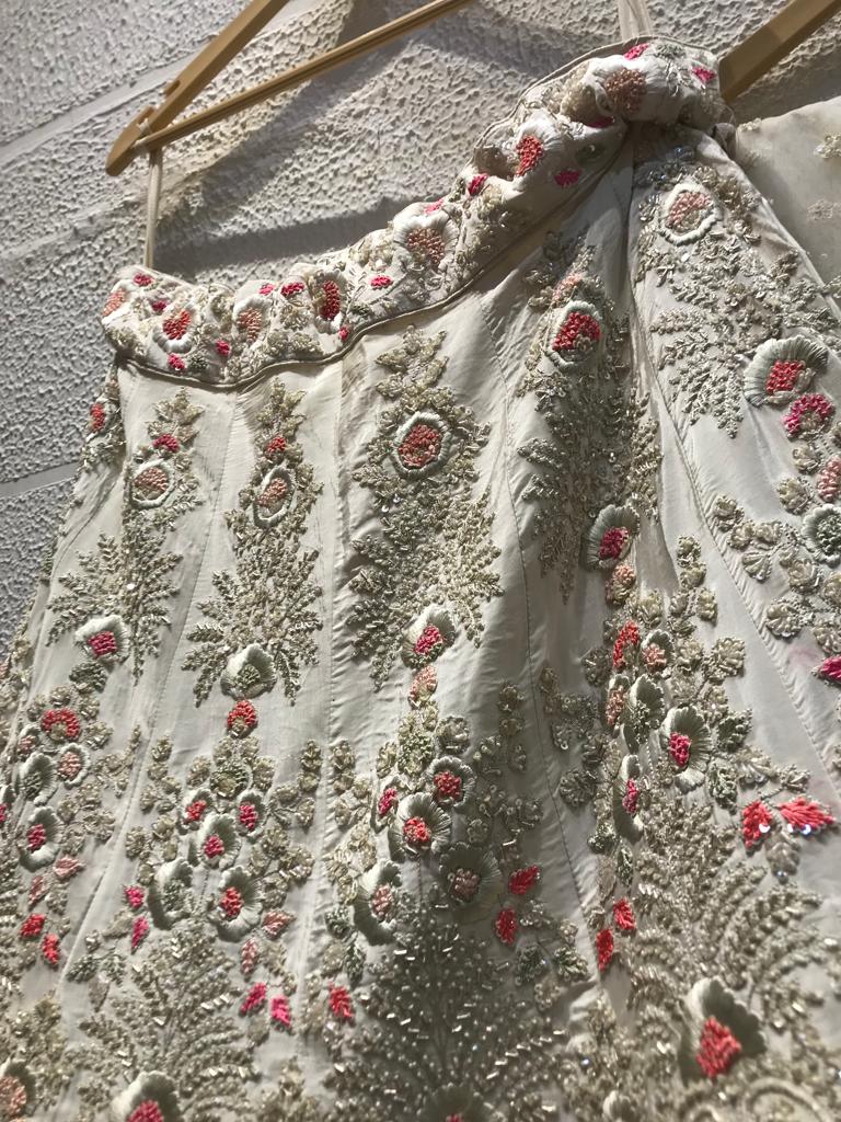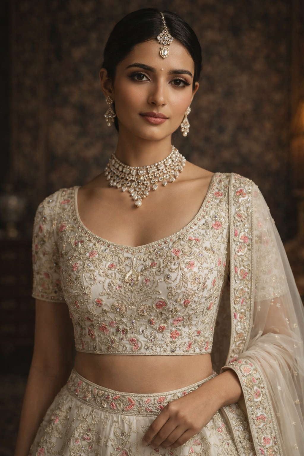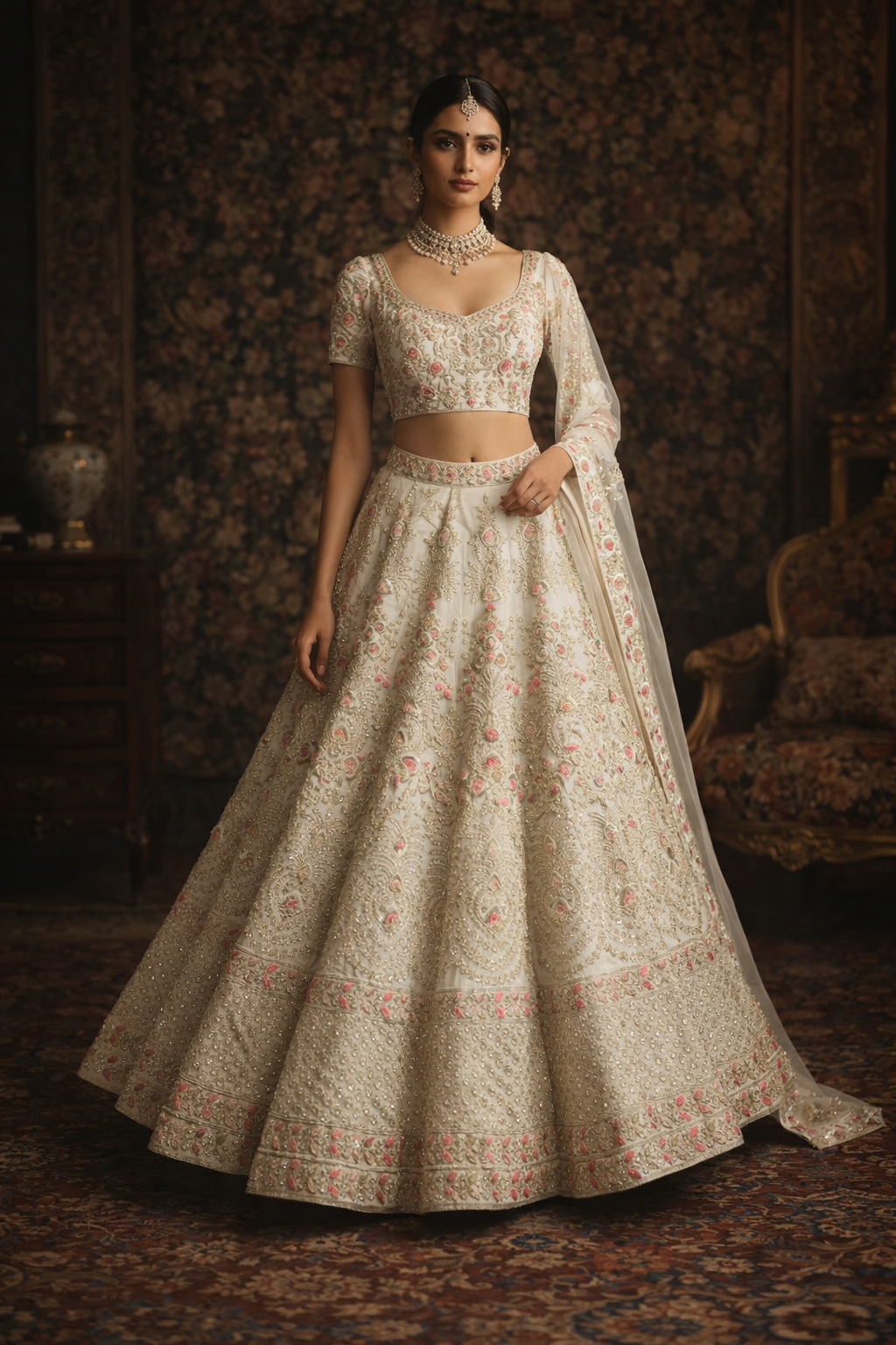This is a lehenga for the bride who understands that true luxury often speaks in hushed tones. Where ivory becomes the canvas for delicate artistry, where coral and gold accents bloom like secrets scattered across silk, where every detail is intentional yet effortless.