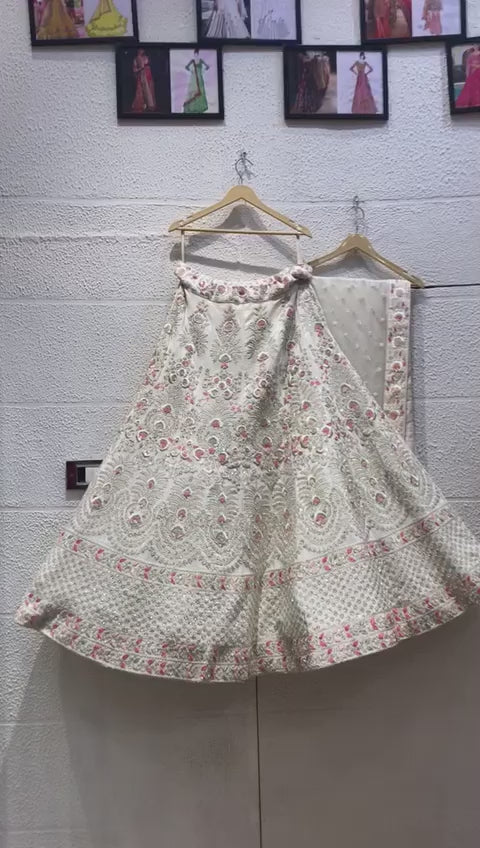 The silhouette is classic and timeless: a beautifully embroidered lehenga with a structured border, paired with a coordinating dupatta that features scattered floral motifs. The blouse (not fully visible but coordinating with the ensemble) would complete this vision of understated bridal elegance.
