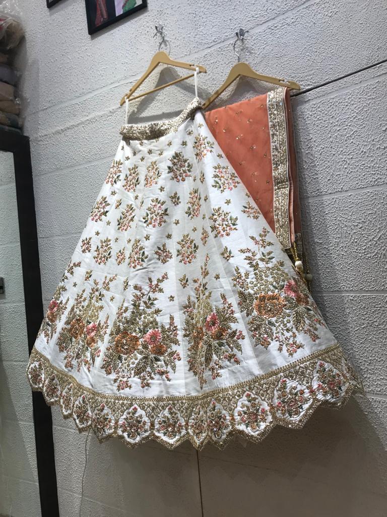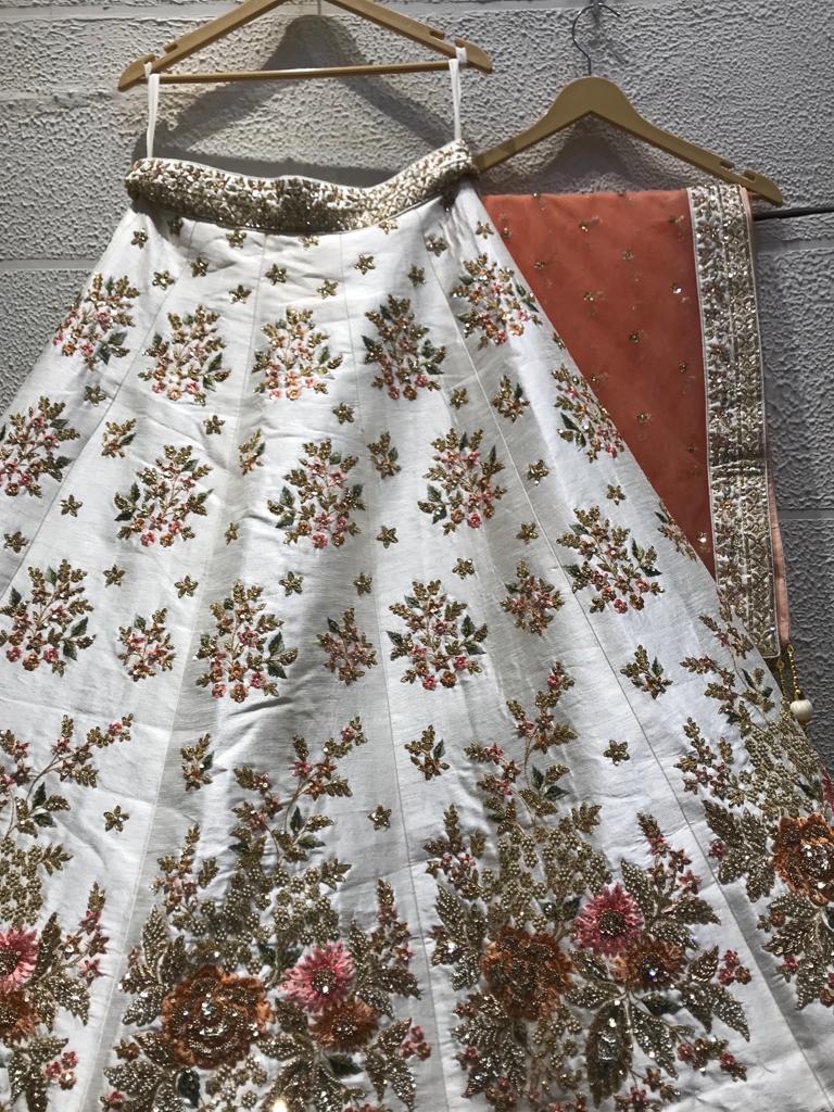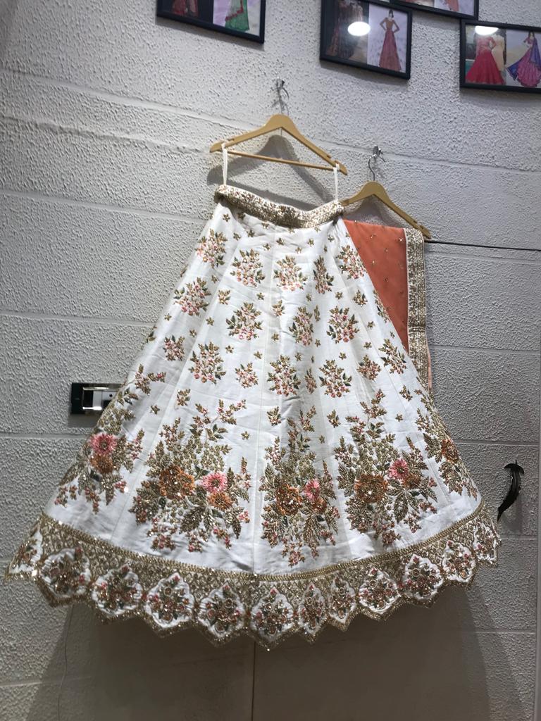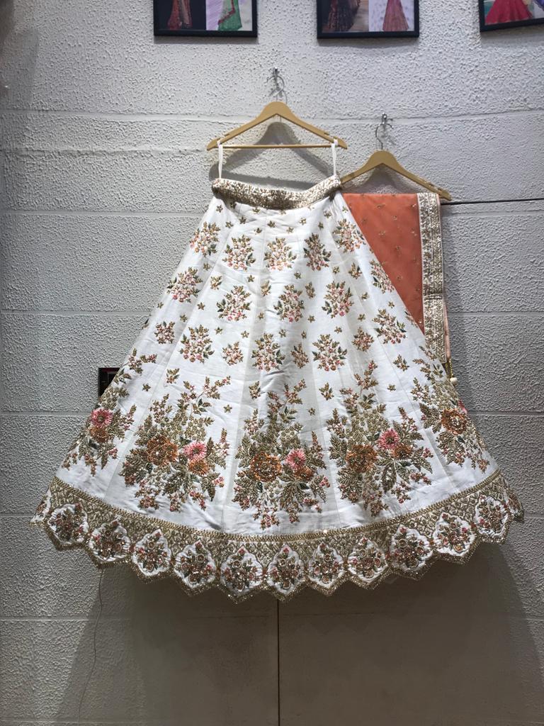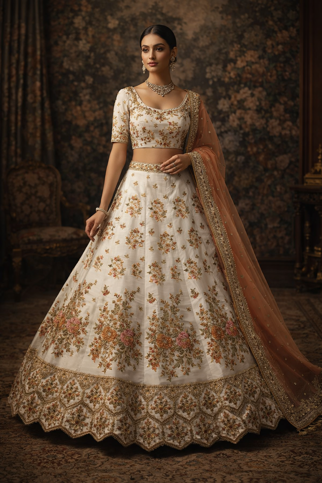 This is a lehenga that looks like it bloomed from a dream—pristine white canvas scattered with gardens of embroidered flowers in the softest coral and gold, paired with a blush peach dupatta that adds warmth like sunset touching snow. It's fresh, it's romantic, it's the kind of ensemble that makes people stop mid-conversation just to admire.