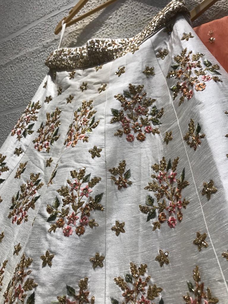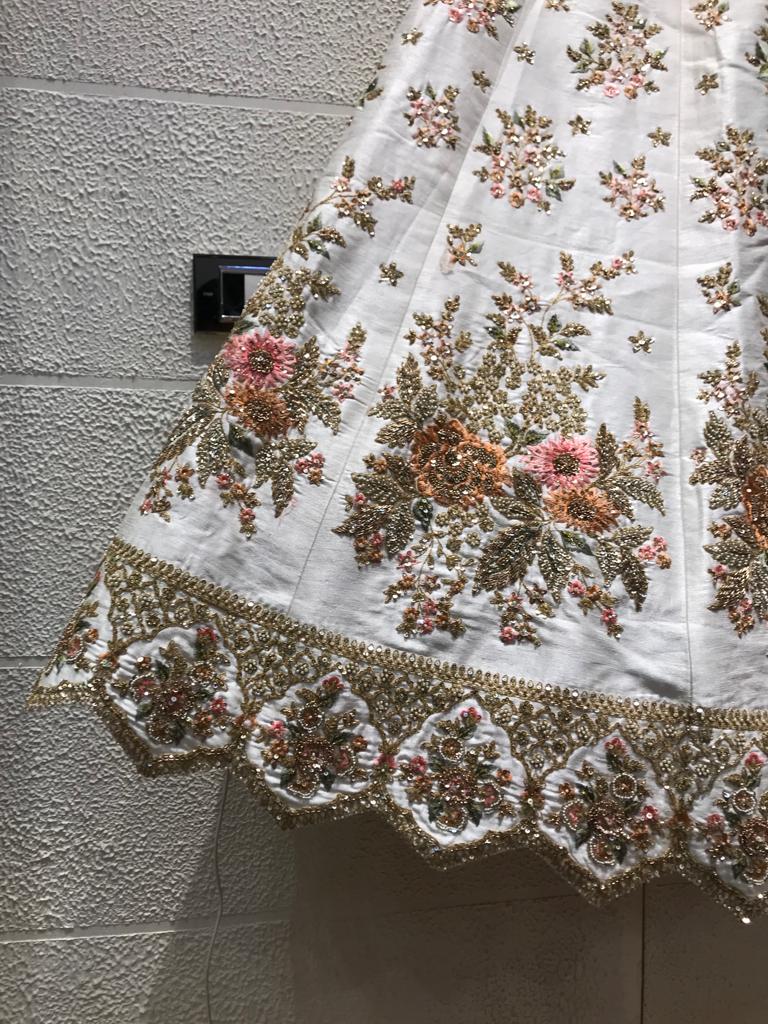 When you move, the lehenga flows like water, the white fabric creating beautiful movement while the embroidery catches light at every angle. It's designed to photograph beautifully—the scattered florals creating visual interest from every angle, the border ensuring every twirl is picture-perfect.