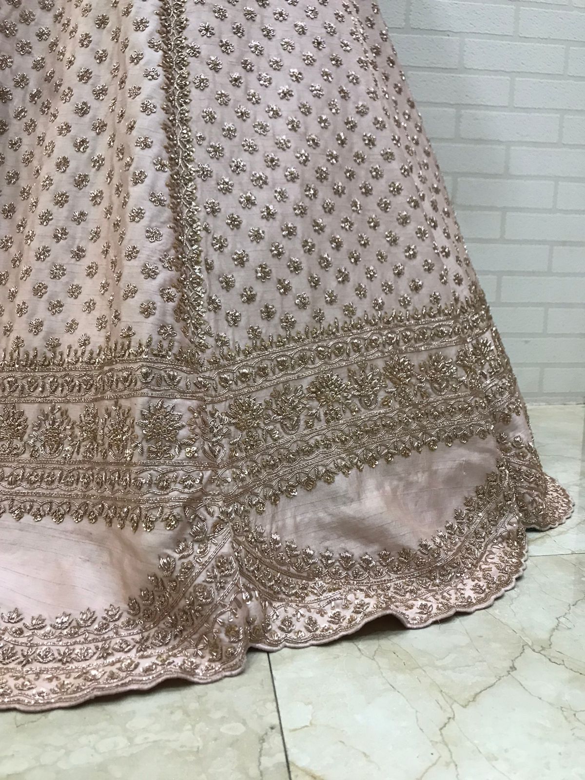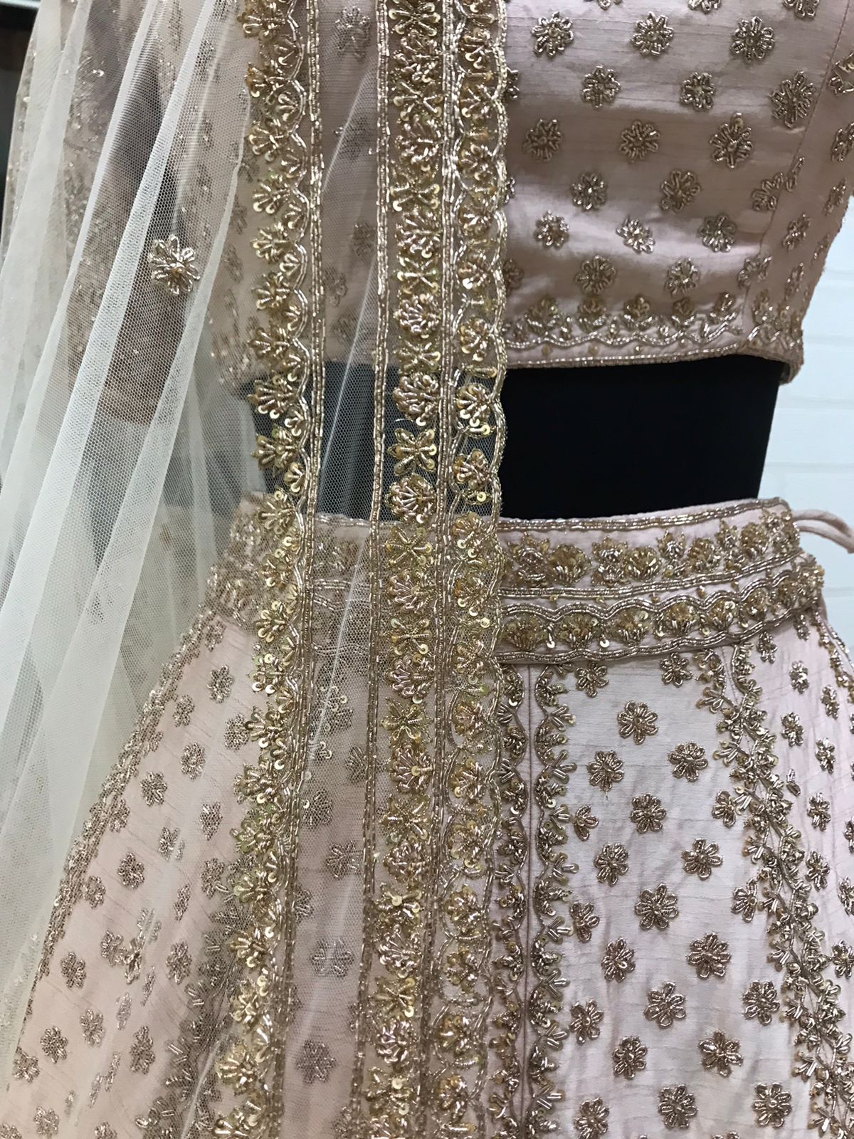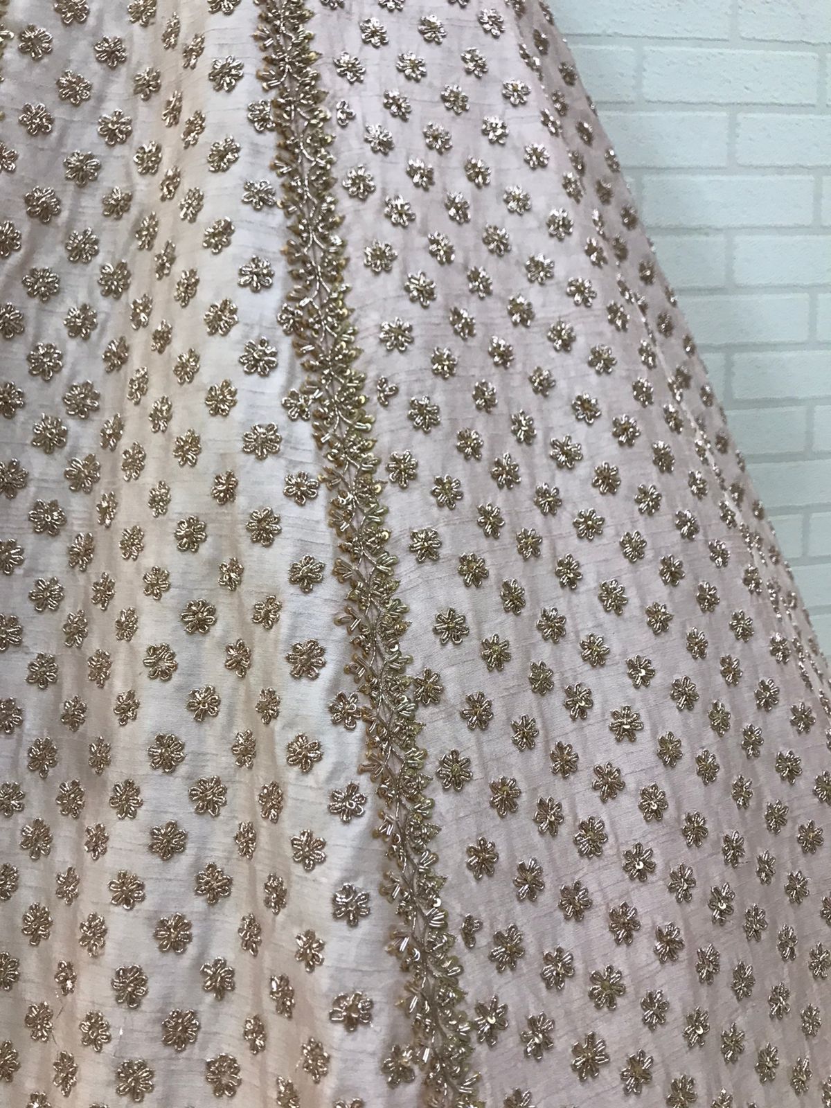 Color Coordination: Achieving perfect tonal harmony is challenging. The blush pink base fabric must complement the rose gold embroidery without clashing. The sequins are selected in multiple rose gold shades—some warmer, some cooler—to create depth within the tonal palette.