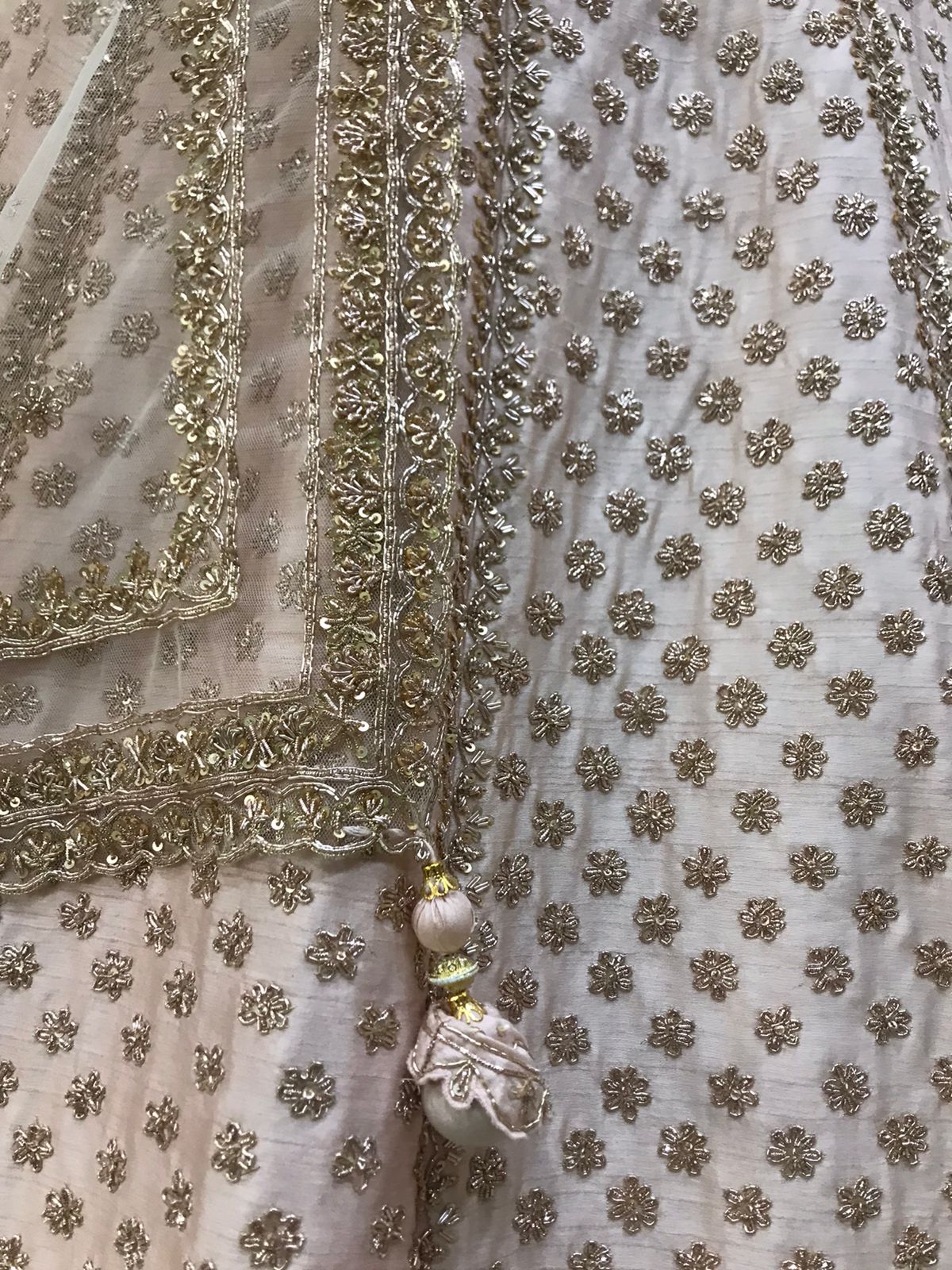 - Embroidery Coverage: All-over rose gold sequin and thread booti work