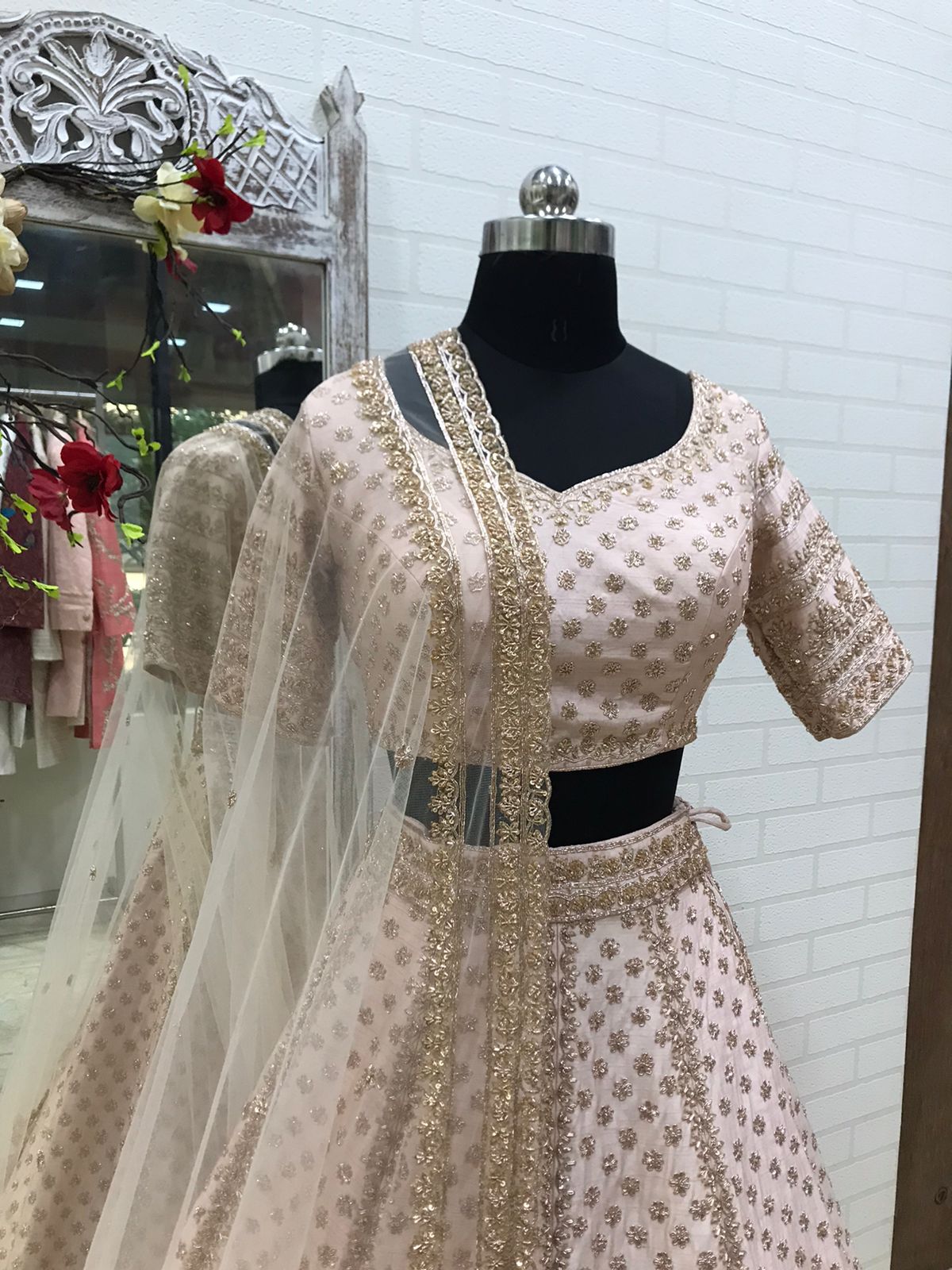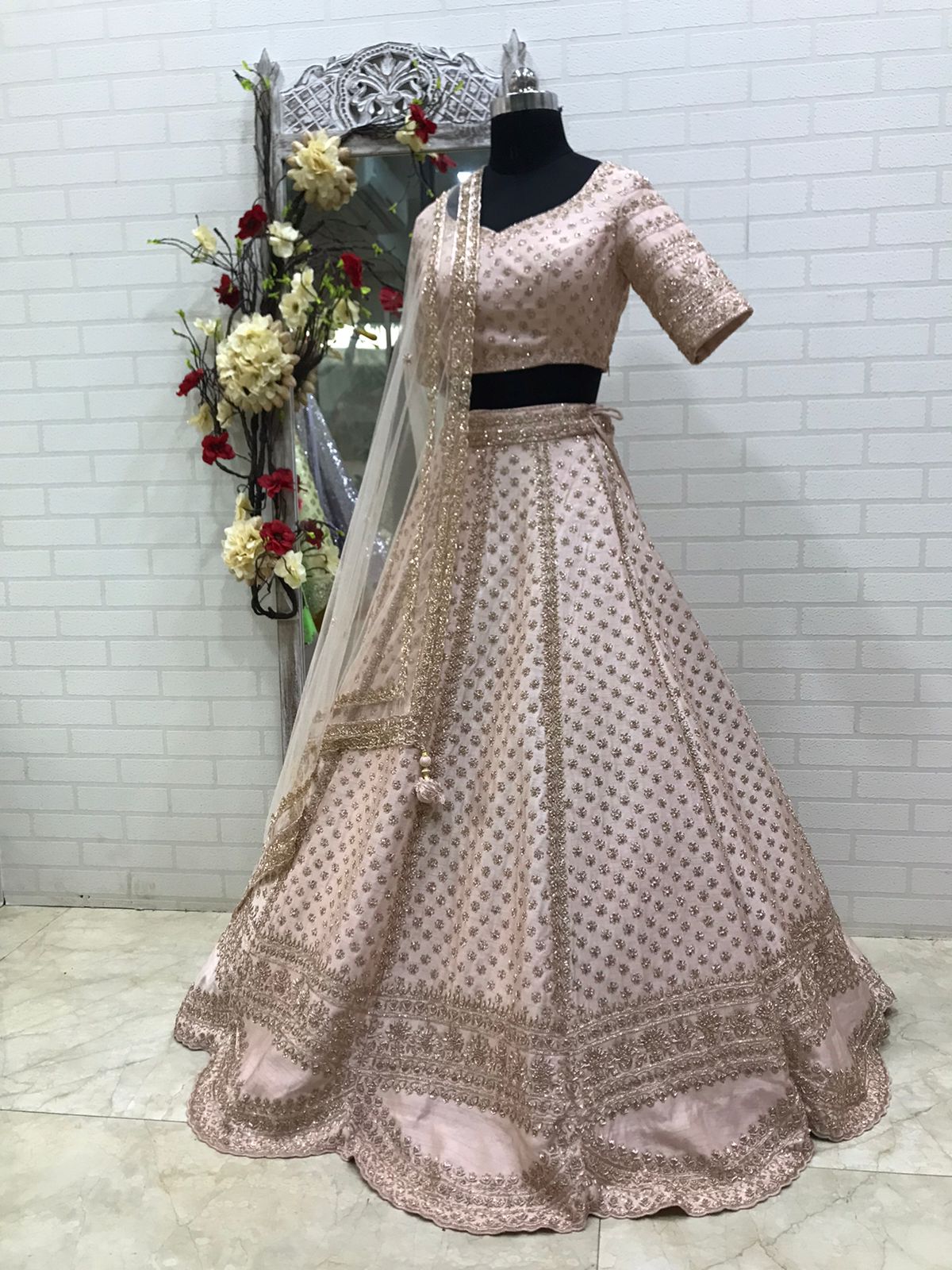 Crafted entirely in delicate blush with rose gold sequin and threadwork, this lehenga celebrates tonal sophistication—where every stitch shimmers softly, every motif catches light like captured sunlight, and every detail whispers couture.