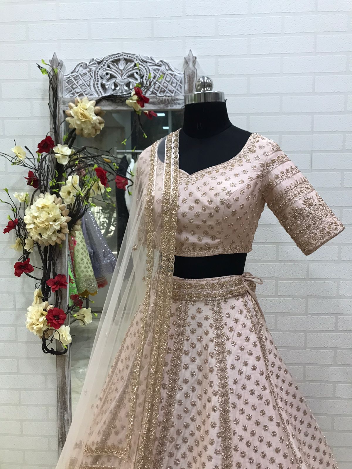 Panel Construction: The vertical embroidered panels on the lehenga are created separately, then integrated during assembly. Each panel features denser embroidery than the surrounding areas, creating subtle texture variation.