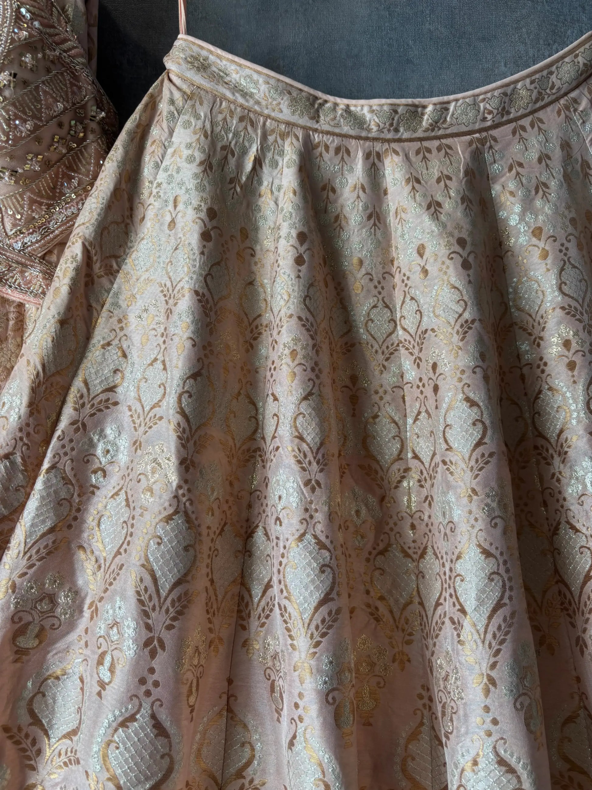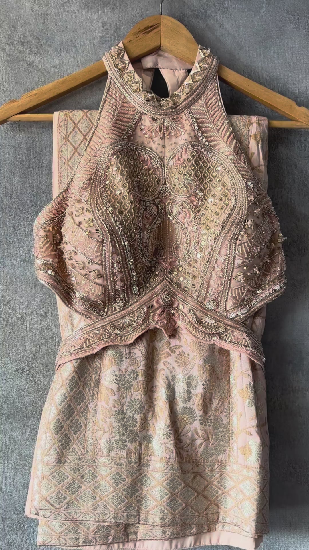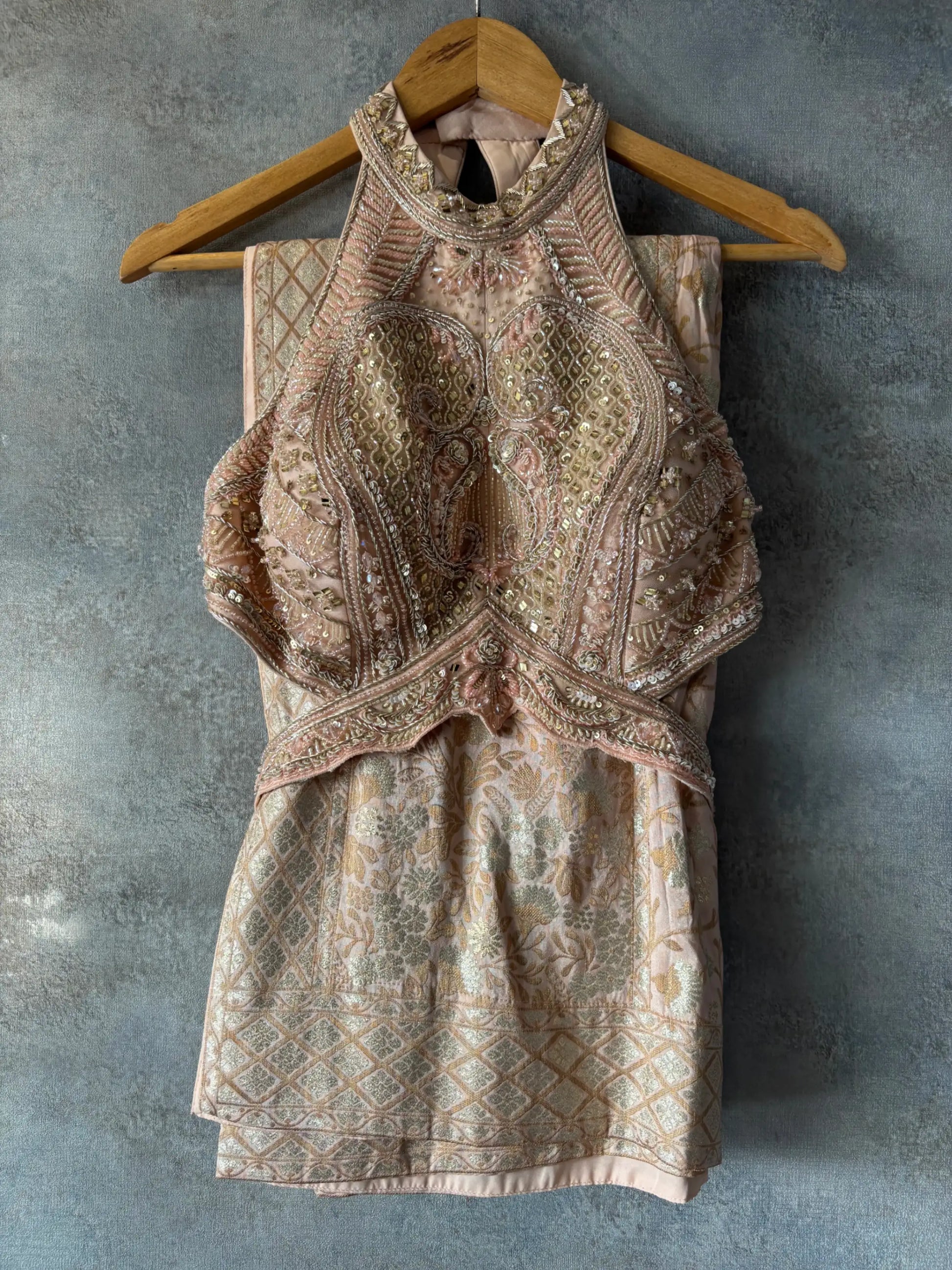 The Rose Gold Reverie is the outfit that changes the game—a high-neck sleeveless peplum masterpiece that sits somewhere between Victorian corset artistry and contemporary Indo-Western fusion. This is what happens when a lehenga goes to Paris Fashion Week and comes back with architectural ambitions.