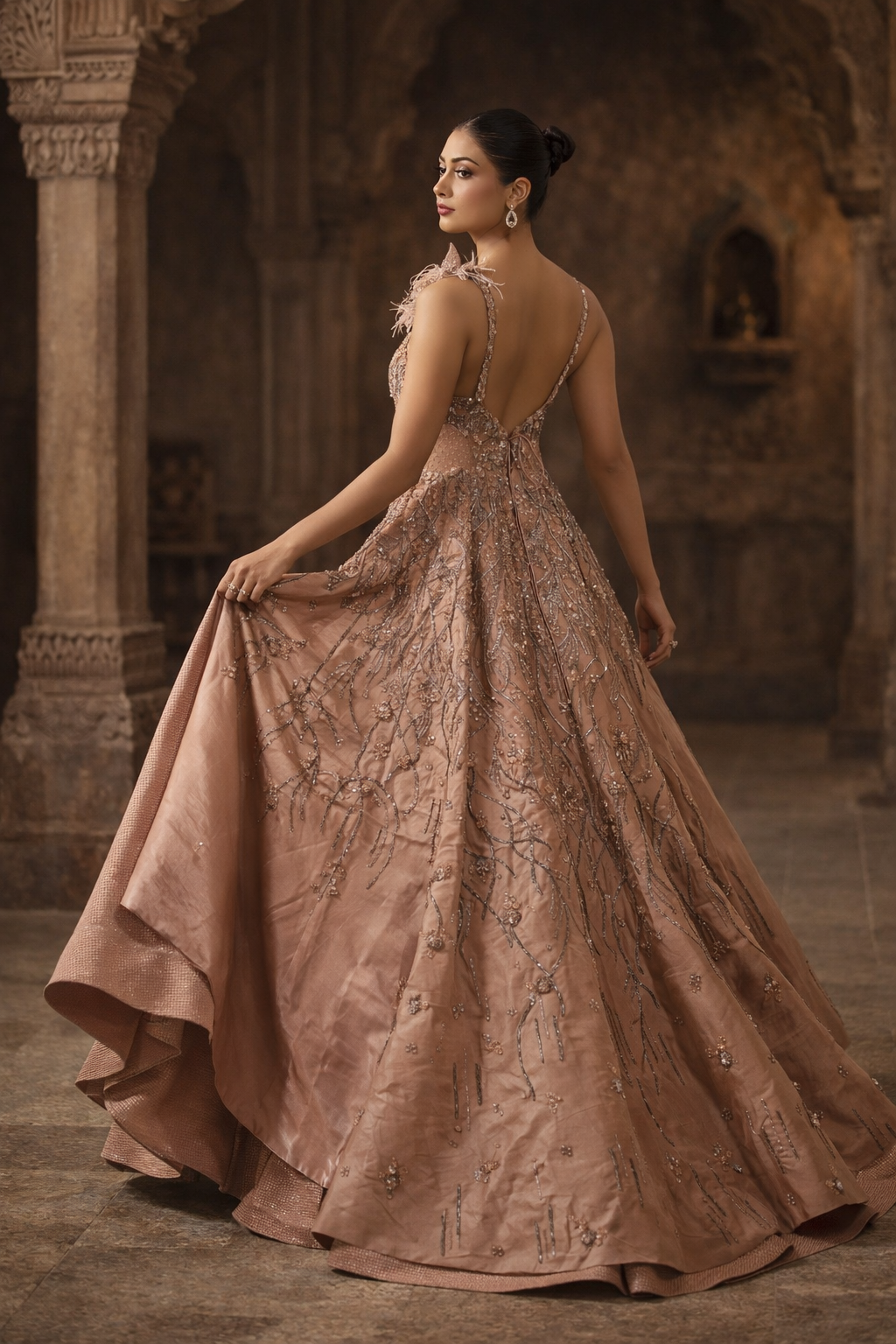 Rose Gold Reverie represents the marriage of Western construction techniques with Indian embroidery mastery—over 350+ hours of cumulative artisan work.