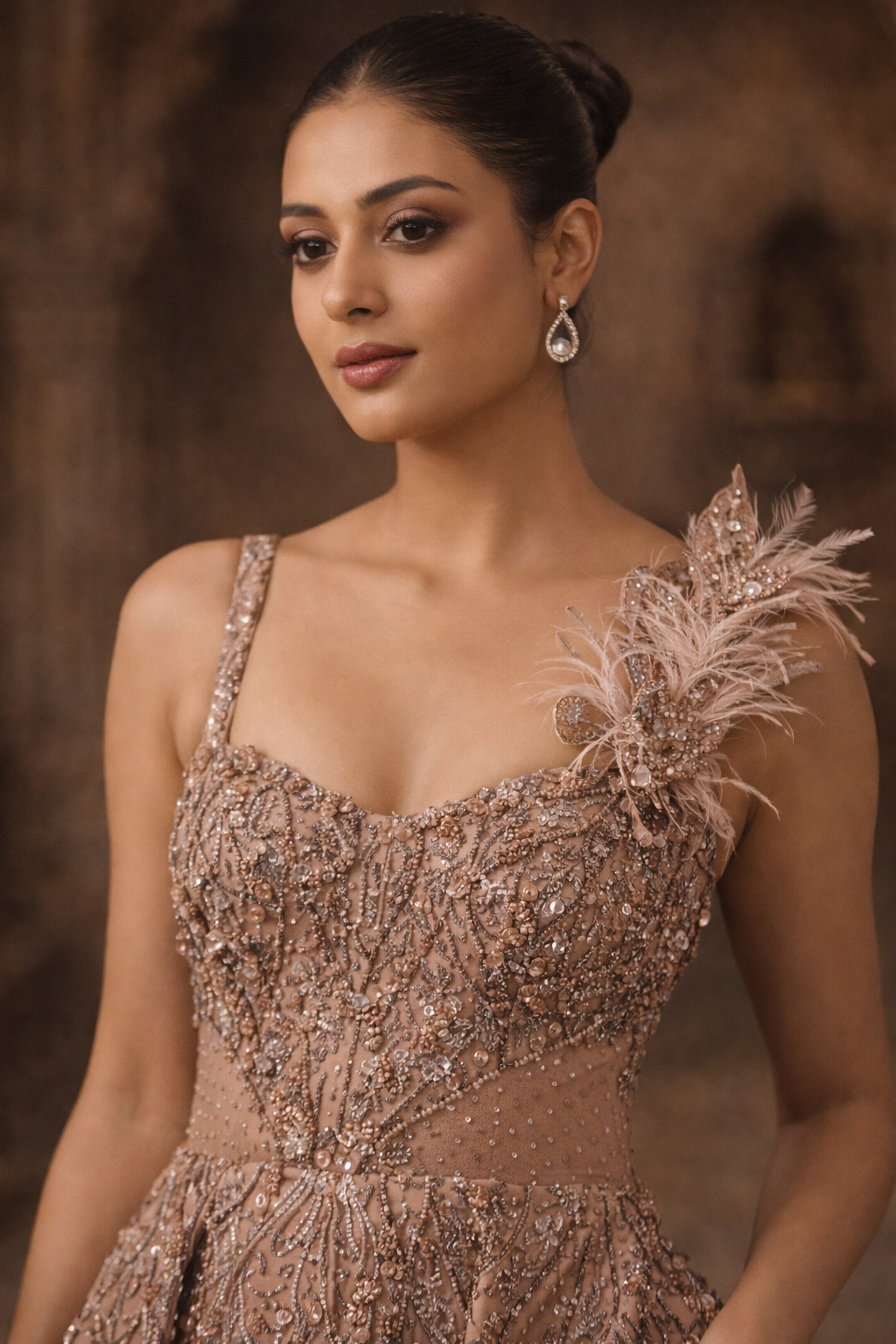 There are gowns that make you feel beautiful. And then there's Rose Gold Reverie—a creation so luminously elegant, so perfectly balanced between romance and sophistication, that it doesn't just make you feel beautiful, it makes you unforgettable.
