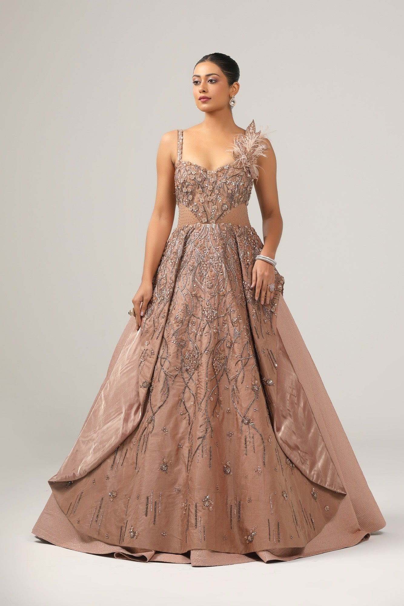 Draped in the warmest shade of rose gold with intricate vine and floral embroidery in silver and bronze tones, this ensemble is for the bride who understands that true elegance lies in the details. Who sees her reception as the moment to shine in contemporary couture. Who knows that the most timeless choice is often the most refined one.