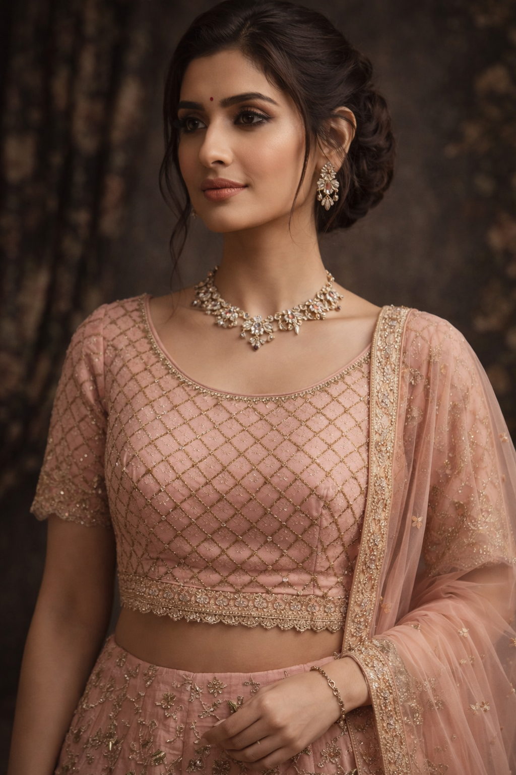 The scalloped bottom edge adds feminine softness to the geometric precision above, creating perfect balance between structure and romance. The gold work catches light beautifully against the rose pink base, ensuring the blouse coordinates perfectly with the elaborate lehenga.