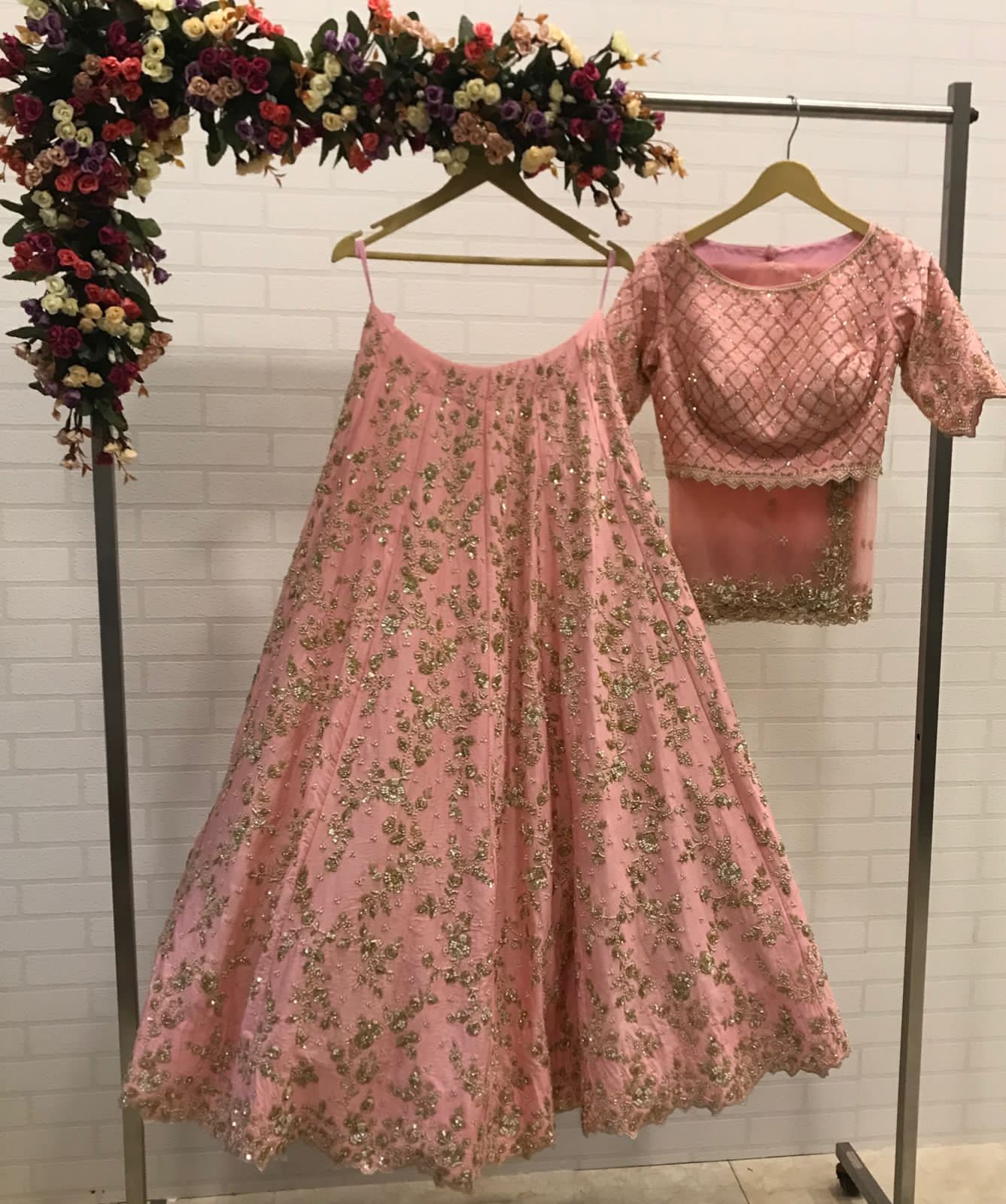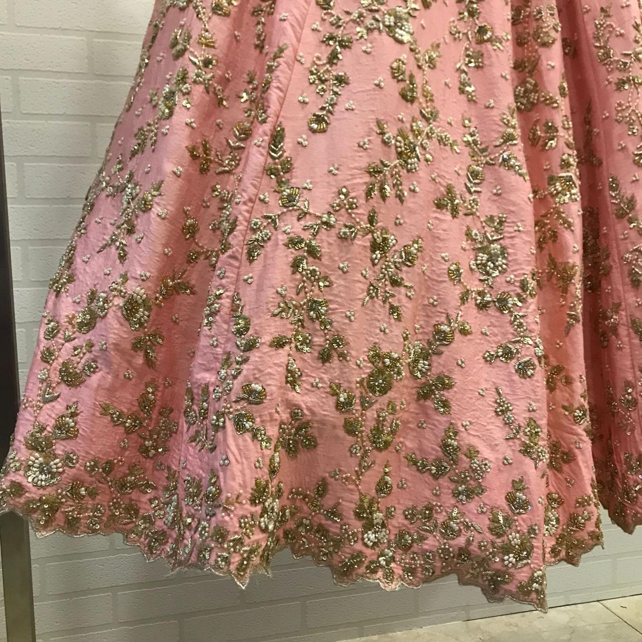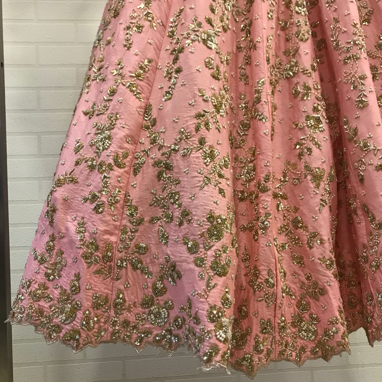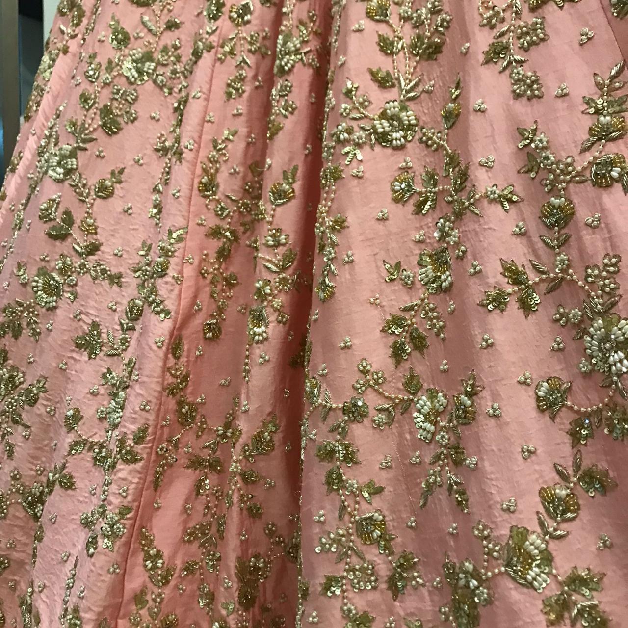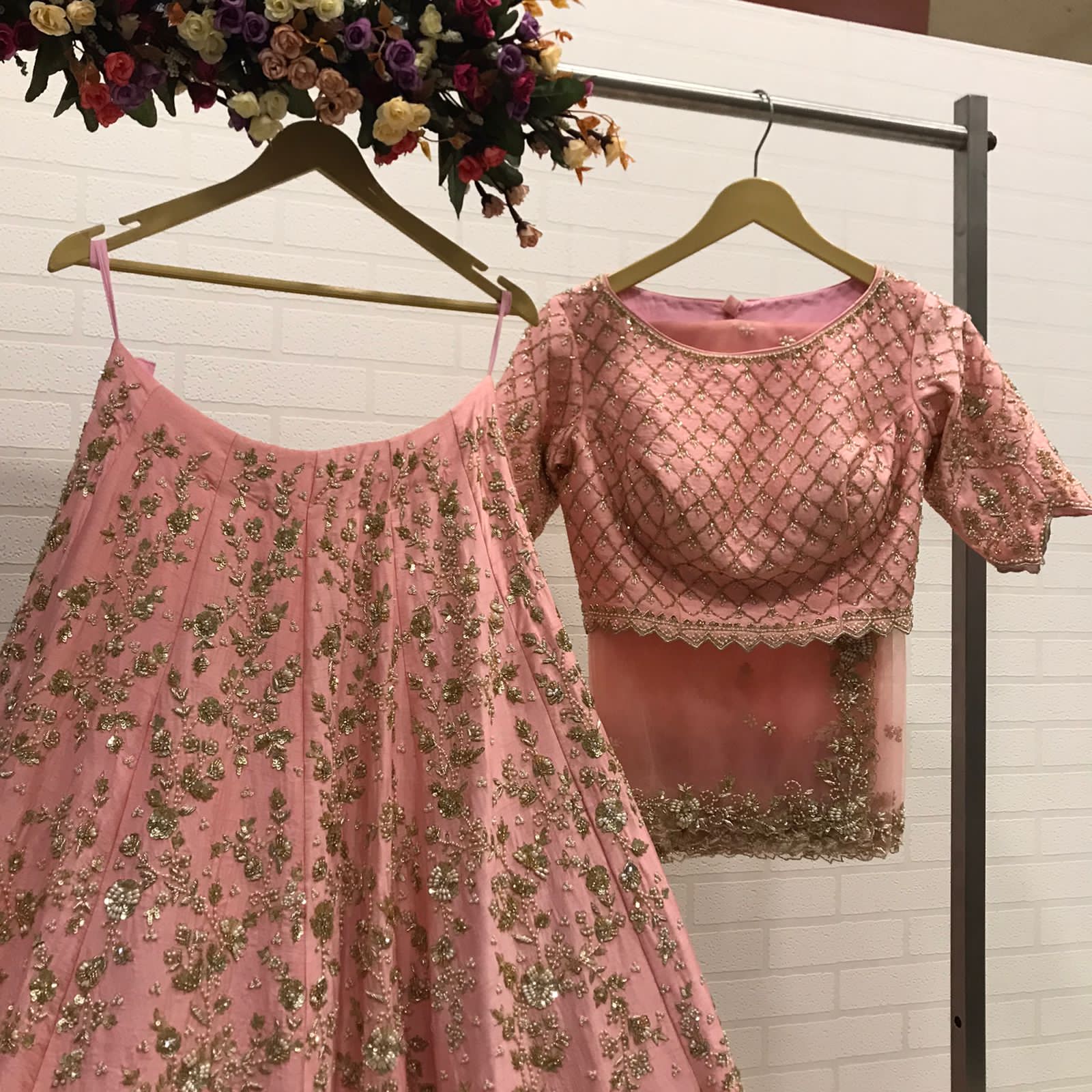 Designed entirely in soft rose pink with elaborate gold embroidery, the silhouette celebrates organic florals, geometric structure, and dimensional embellishment. The short-sleeved blouse features diamond lattice patterns and scalloped borders, while the lehenga flows with scattered floral vines and increasingly dense embroidery that creates a visual journey from delicate to dramatic. The dupatta adds cohesive elegance with coordinating embroidery and lightweight drape.