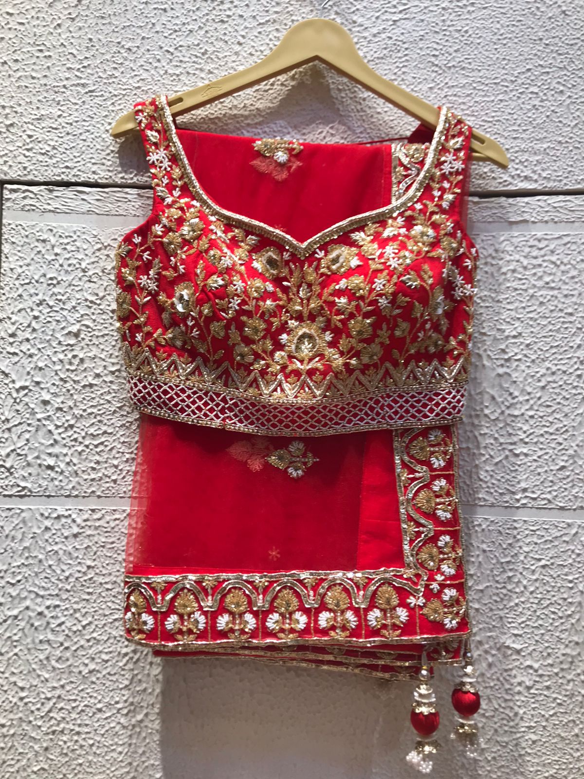 The blouse balances bold color with delicate detail—a perfect complement to the ornate lehenga.