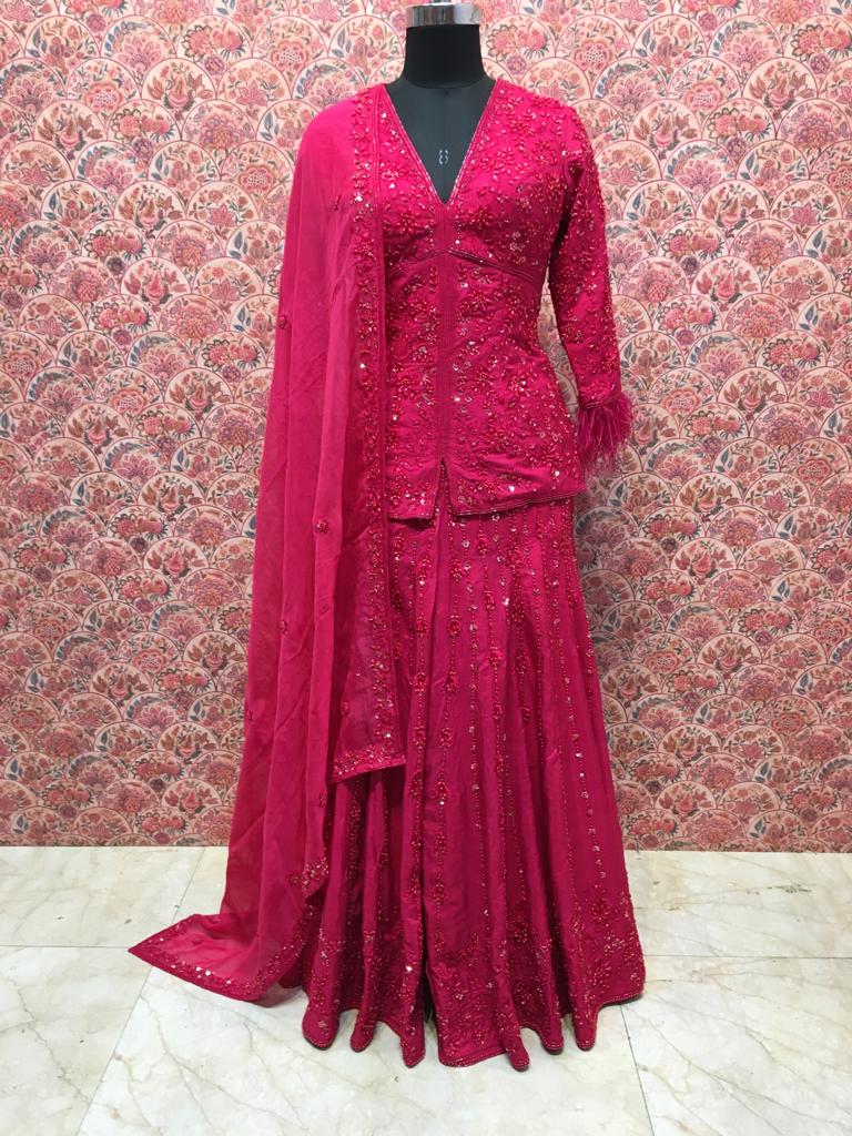 Assembly: The kurta is constructed with princess seams for a tailored fit. The sharara is assembled with reinforced waistband and side seams. All seams are finished with French construction for durability. The entire ensemble is steamed and shaped for perfect drape.