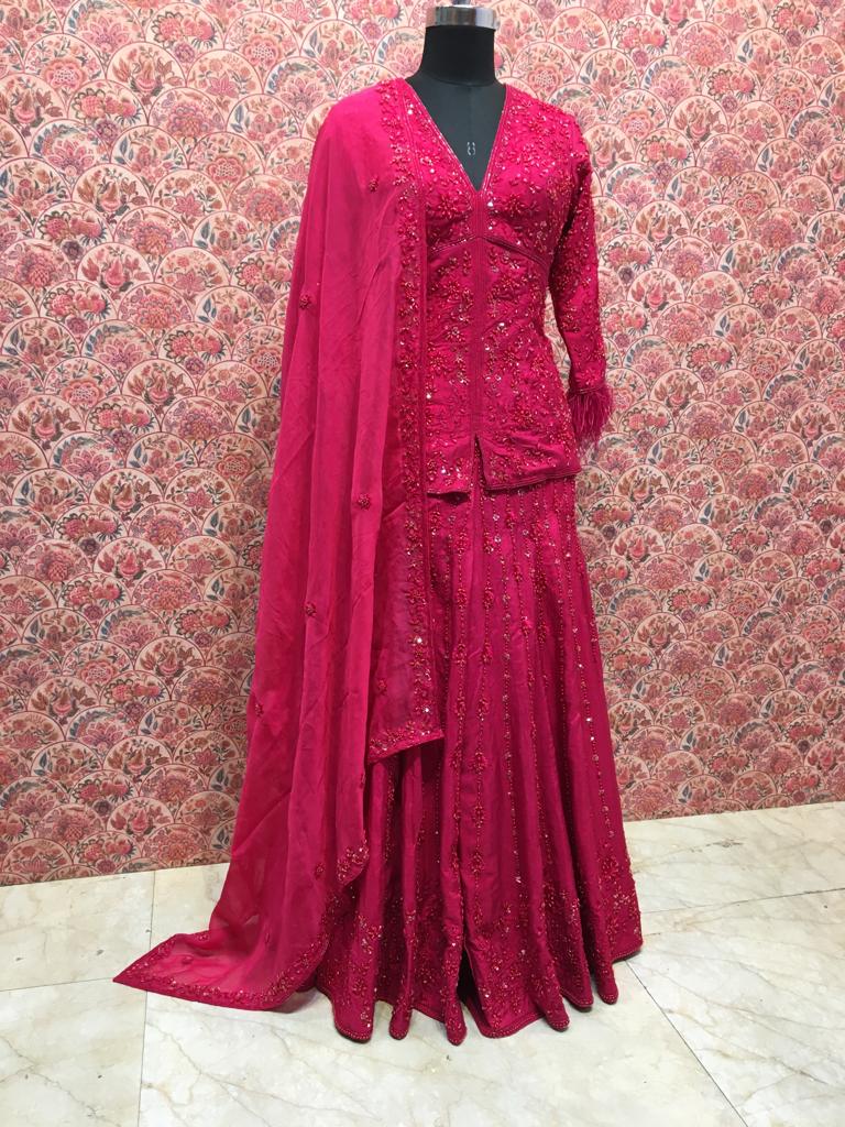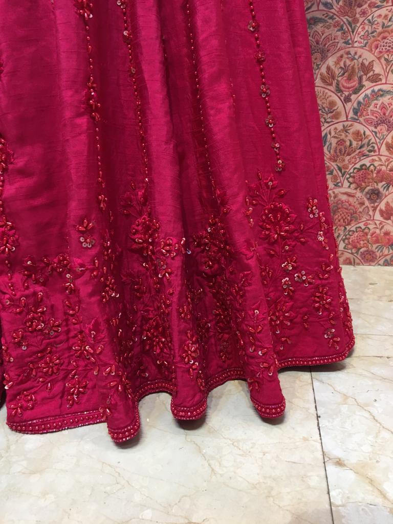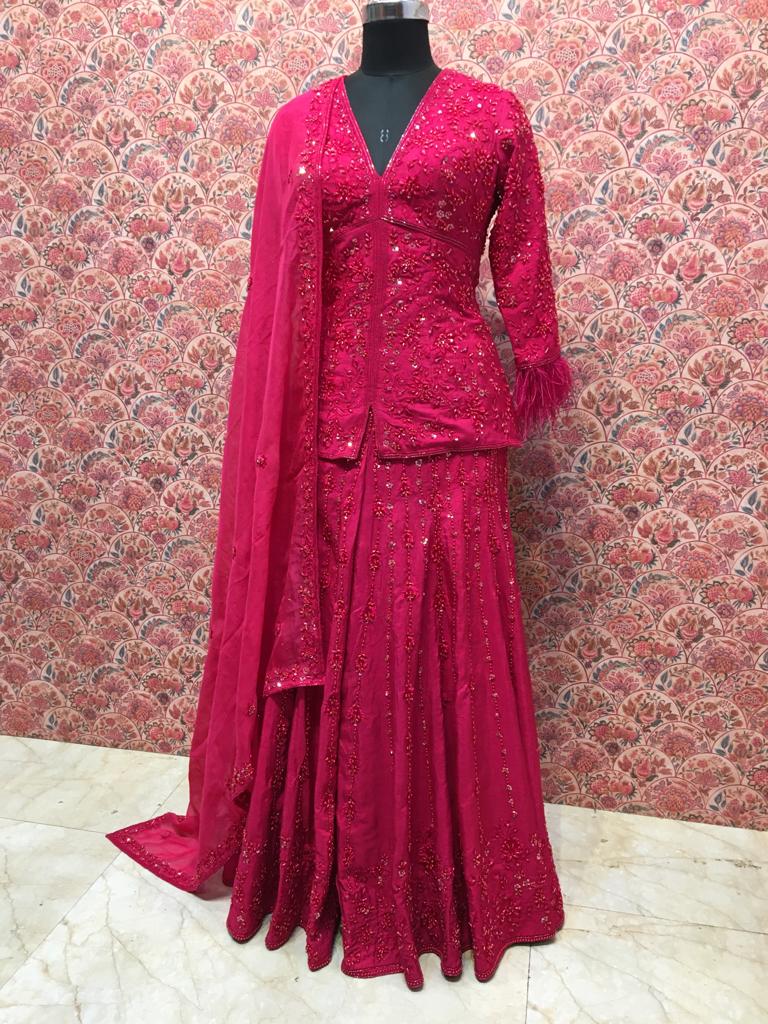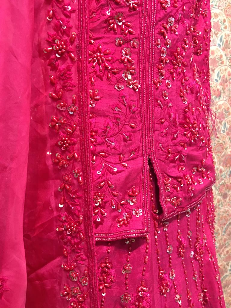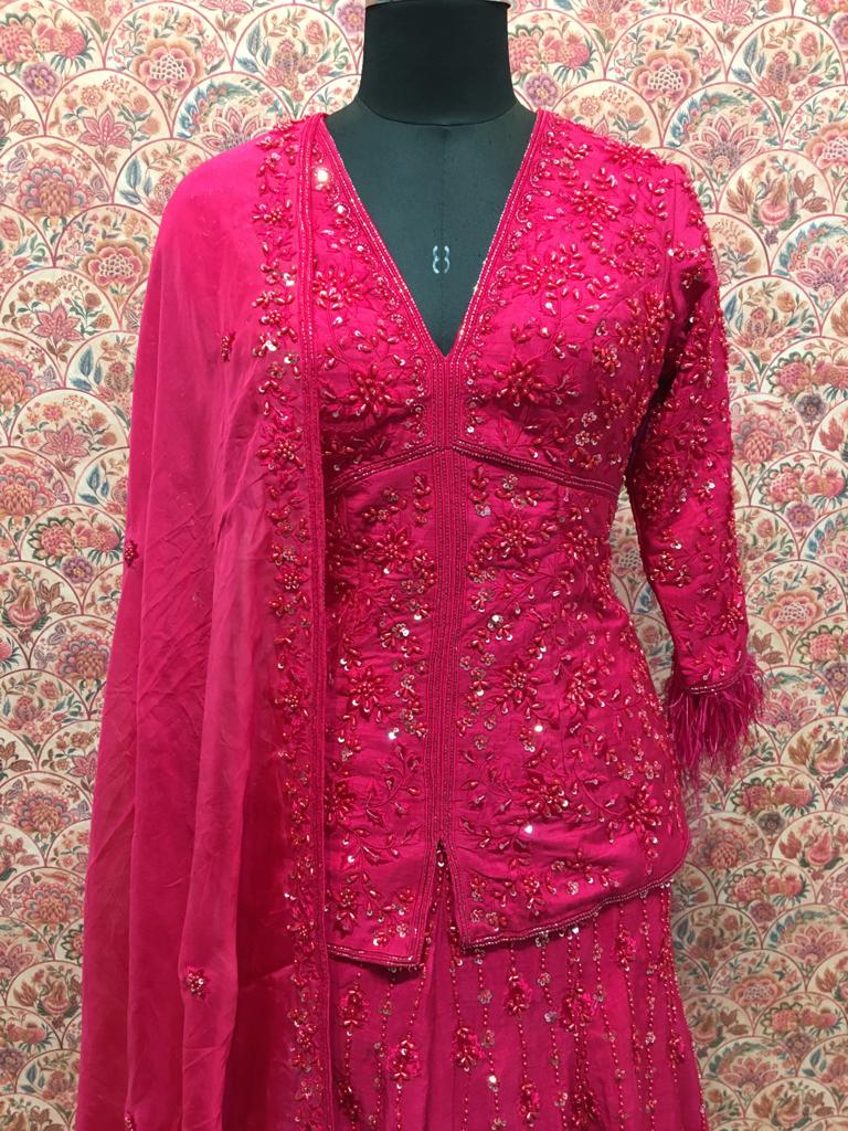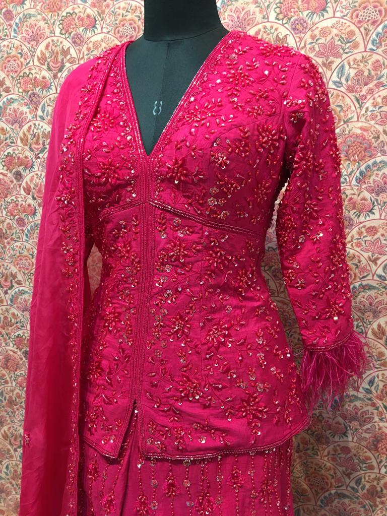 Draped in brilliant fuchsia pink with shimmering sequin embroidery, this ensemble is for the bride who doesn't shy away from color. Who walks into her sangeet or mehendi and becomes the energy of the celebration. Who understands that sometimes, the most elegant choice is the boldest one.