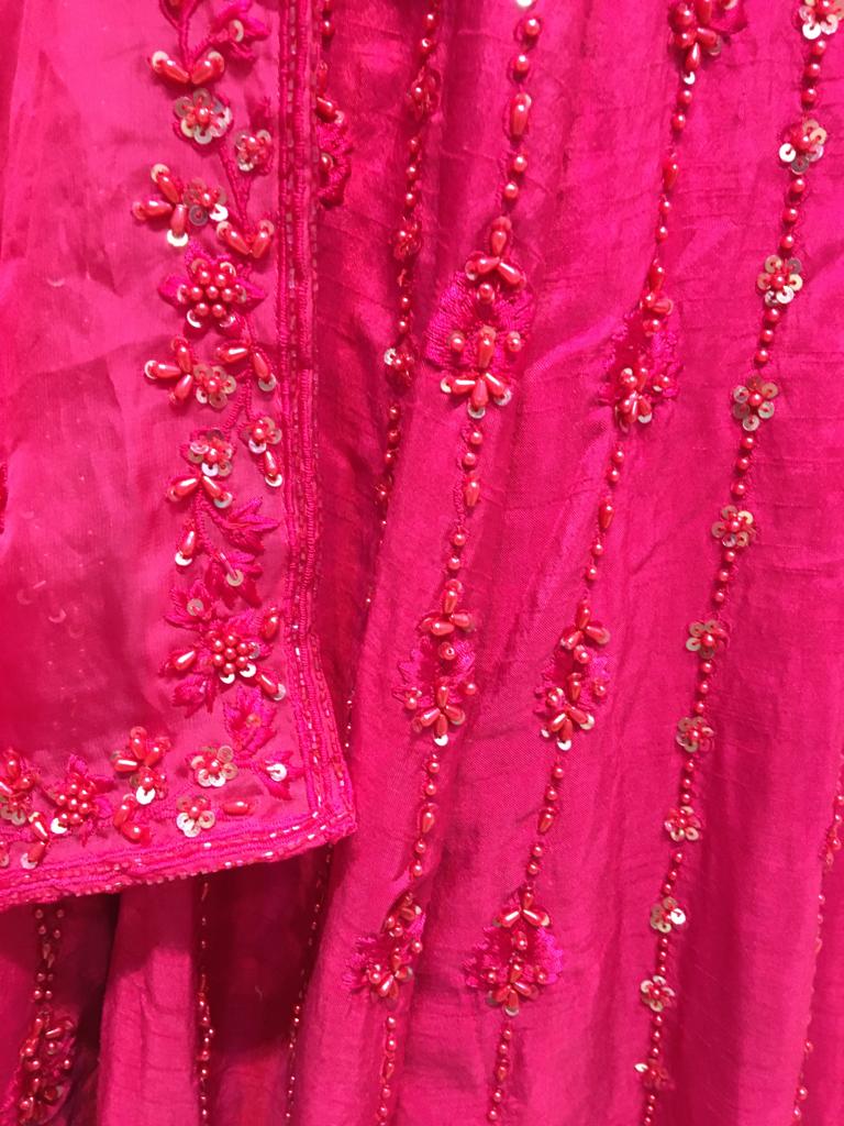 The dupatta is vibrant fuchsia elegance—lightweight yet richly embellished.