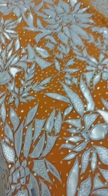 Balanced silver-on-saffron thread-work that creates a luminous, multi-dimensional texture