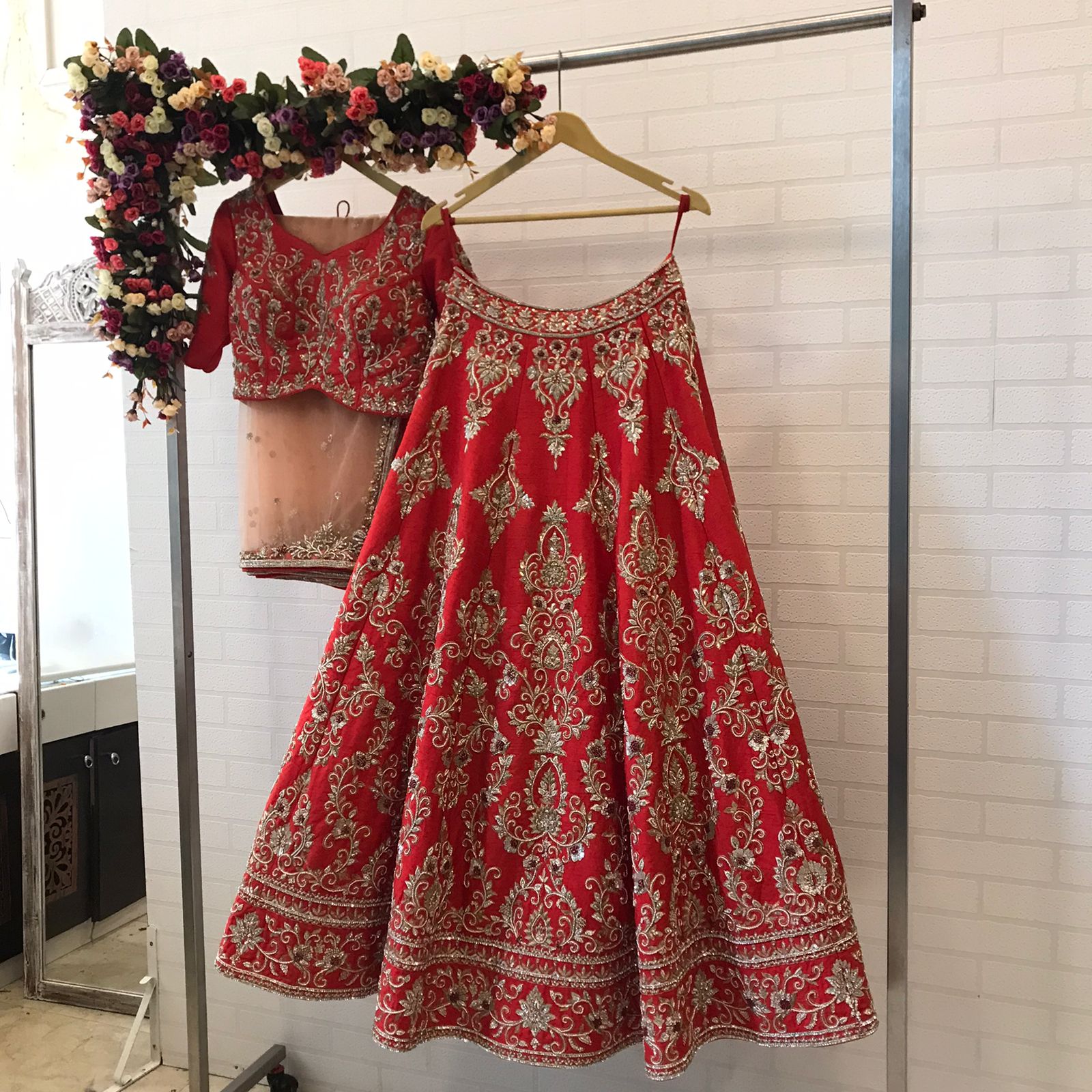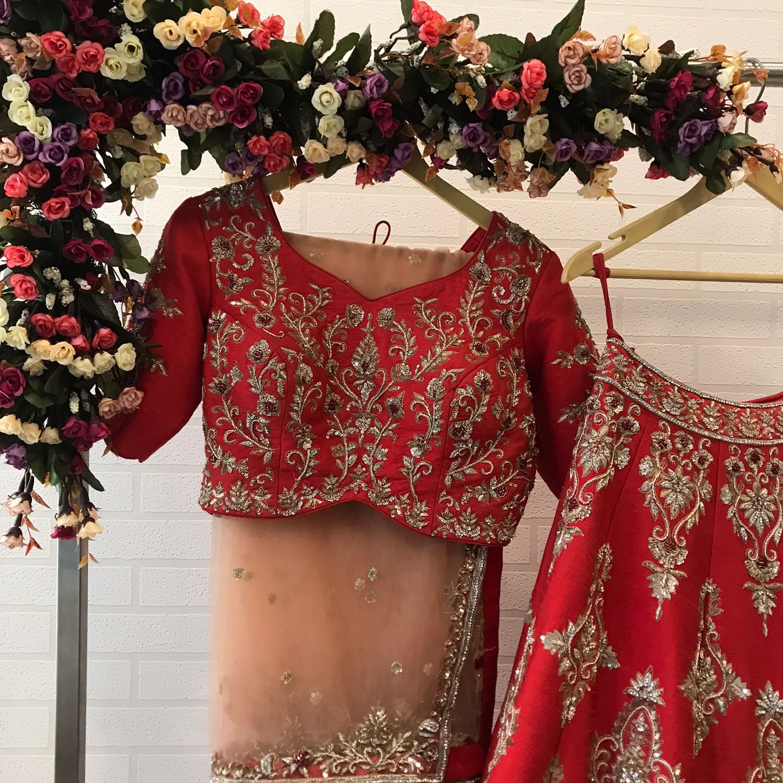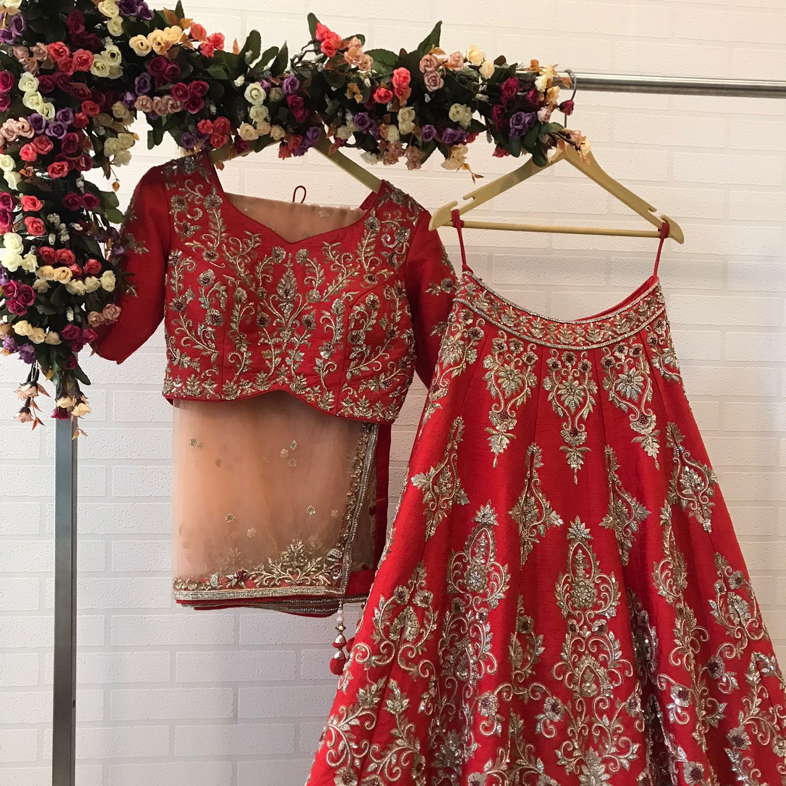The dupatta completes the bridal vision with sheer elegance and scattered beauty.