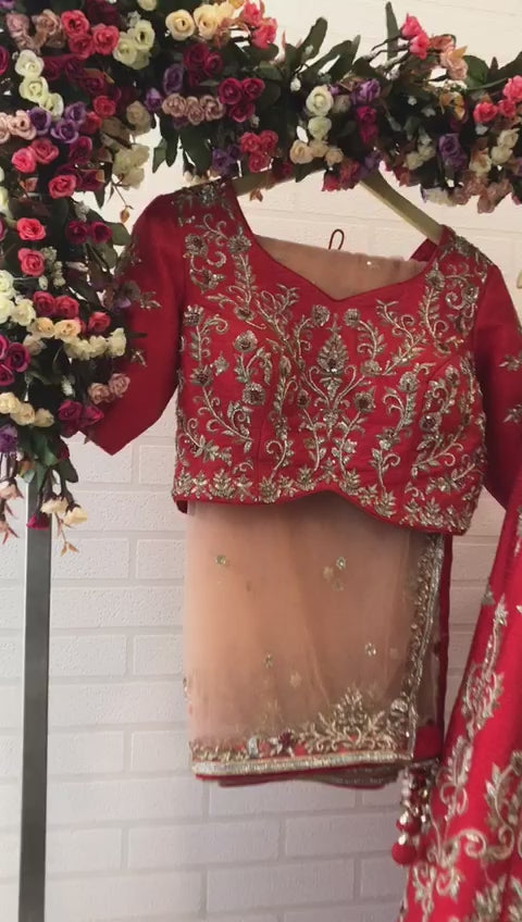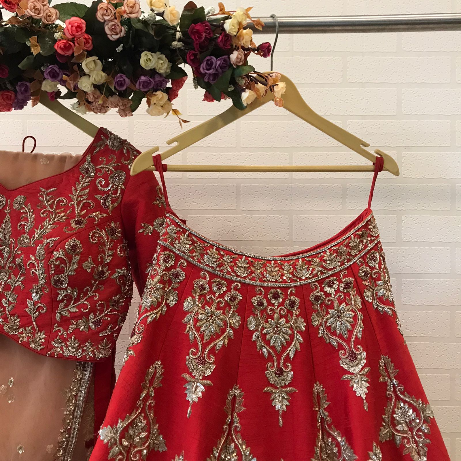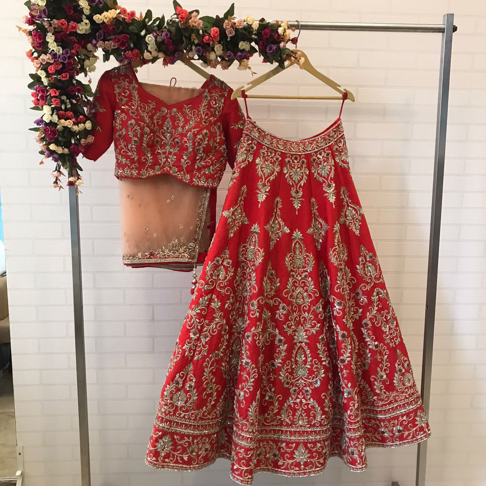 The dupatta completes the bridal vision with sheer elegance and scattered beauty.