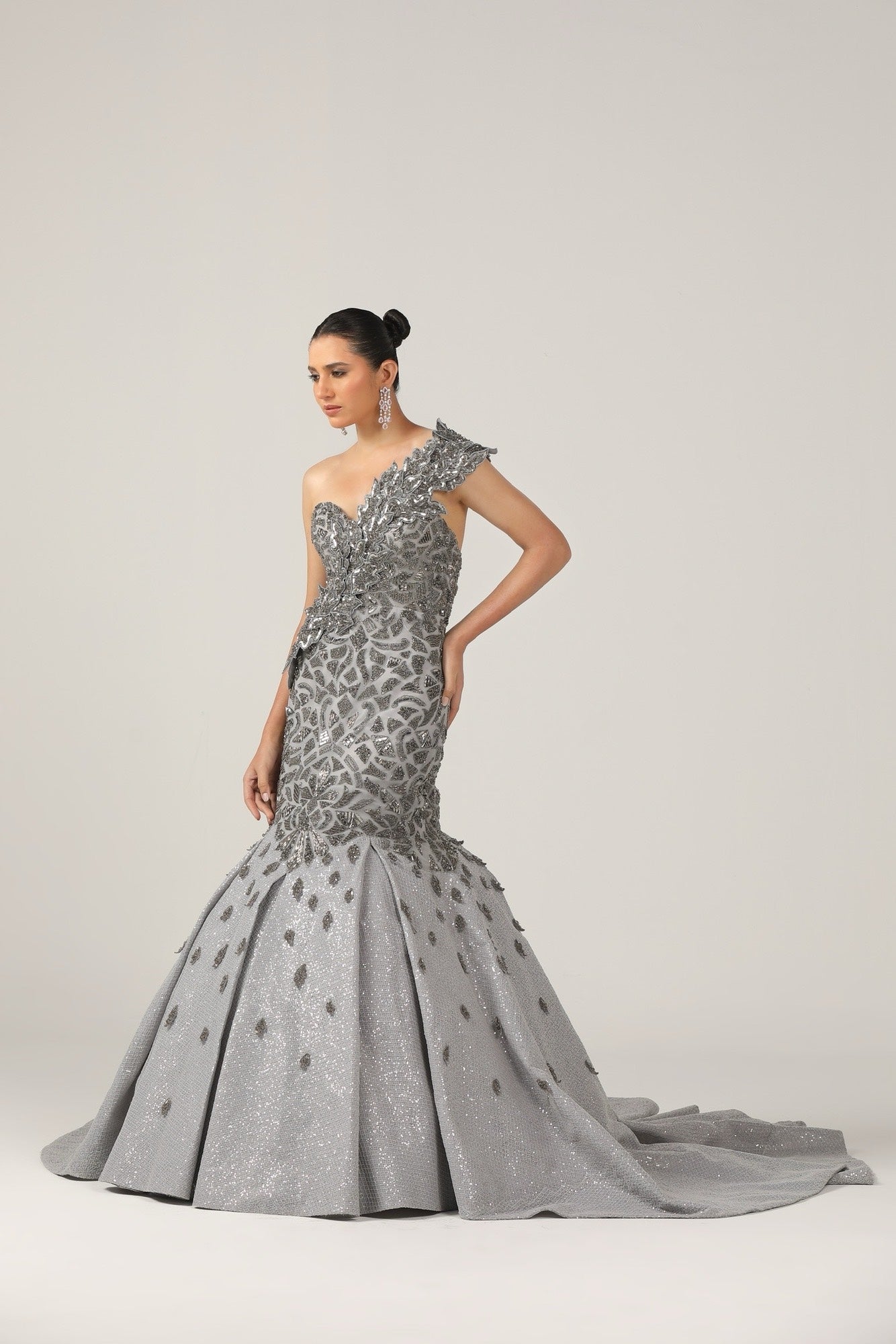 Draped in luminous silver with intricate charcoal embroidery and a mermaid silhouette that culminates in a structured, dramatic flare, this ensemble is for the bride who sees her wedding as her red carpet moment. Who understands that couture is about pushing boundaries. Who knows that the most memorable statement is the boldest one.