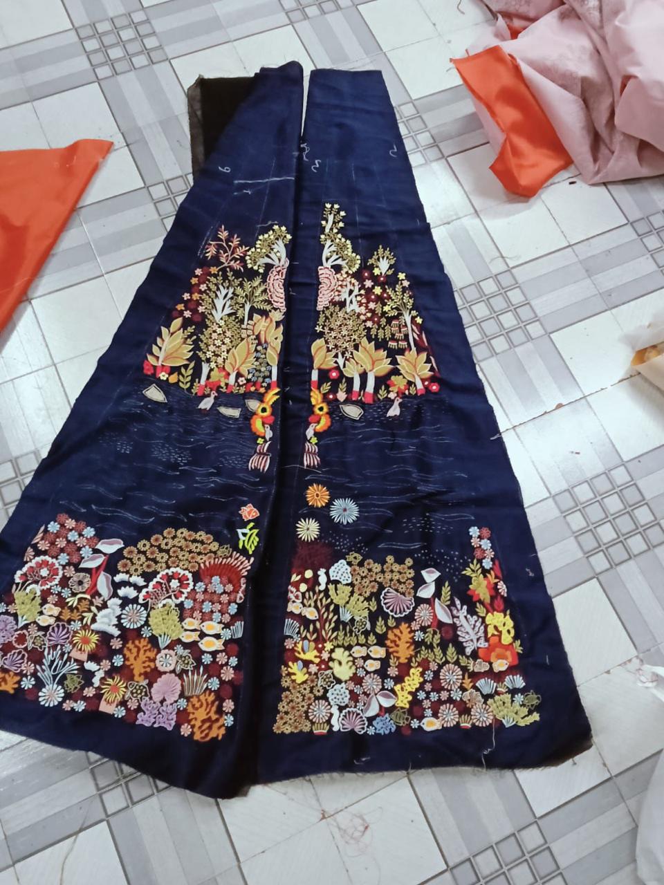 The "Oceanic Odyssey" represents over 480 hours of manual labor. The unique challenge of this piece lies in the "Pictorial Gradient"—the precision required to transition from the geometric sequin sky into the organic thread-work of the coral reef. Each sea shell and coral branch is hand-contoured using a "relief" technique to provide a tactile 3D volume, ensuring the underwater world looks as if it is swaying in the current as the wearer moves.