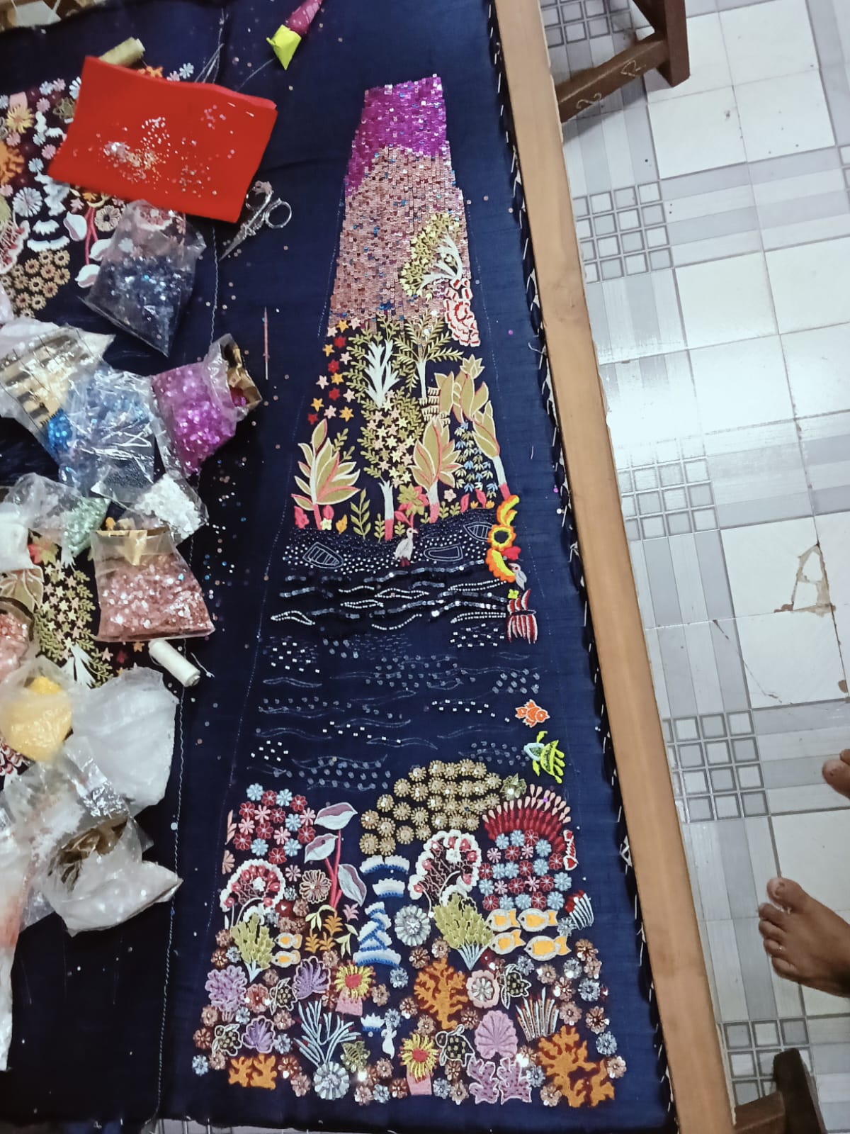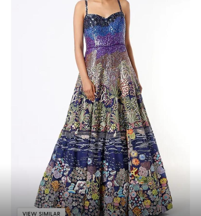 Crafted on a canvas of high-lustre sequins and silk-thread, the gown features a multi-tiered narrative. The bodice begins with a celestial gradient of midnight and azure, descending into a tropical shoreline of palm trees, and finally plunging into a vivid underwater world of hand-shaded corals, sea anemones, and shells.
