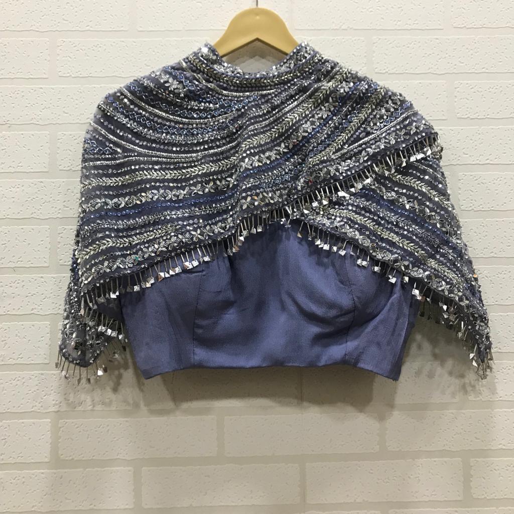 Draped in soft grey-blue with intricate silver embellishment, this outfit breaks away from traditional lehenga constructions, embracing instead a flowing skirt paired with a statement cape—a combination that feels fresh, modern, and utterly captivating.